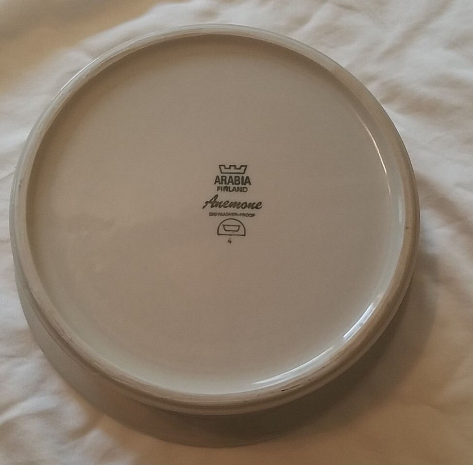 Description: Arabia Finland Blue Anemone 9″ Vegetable Serving Bowl The color is cream with a blue floral pattern. Bowl measures 3″ tall and 9″ in diameter. Bowl is in excellent pre-owned condition.