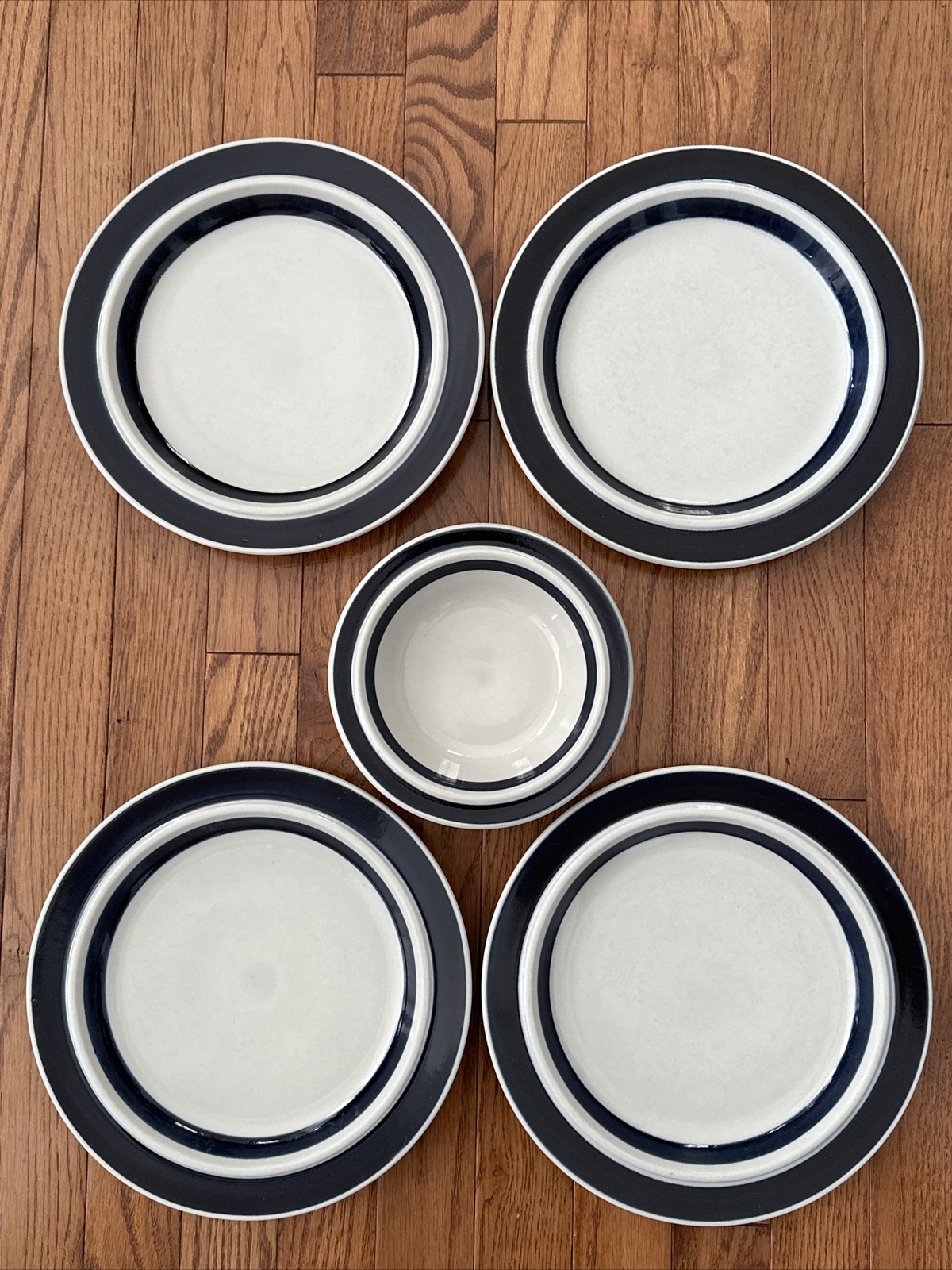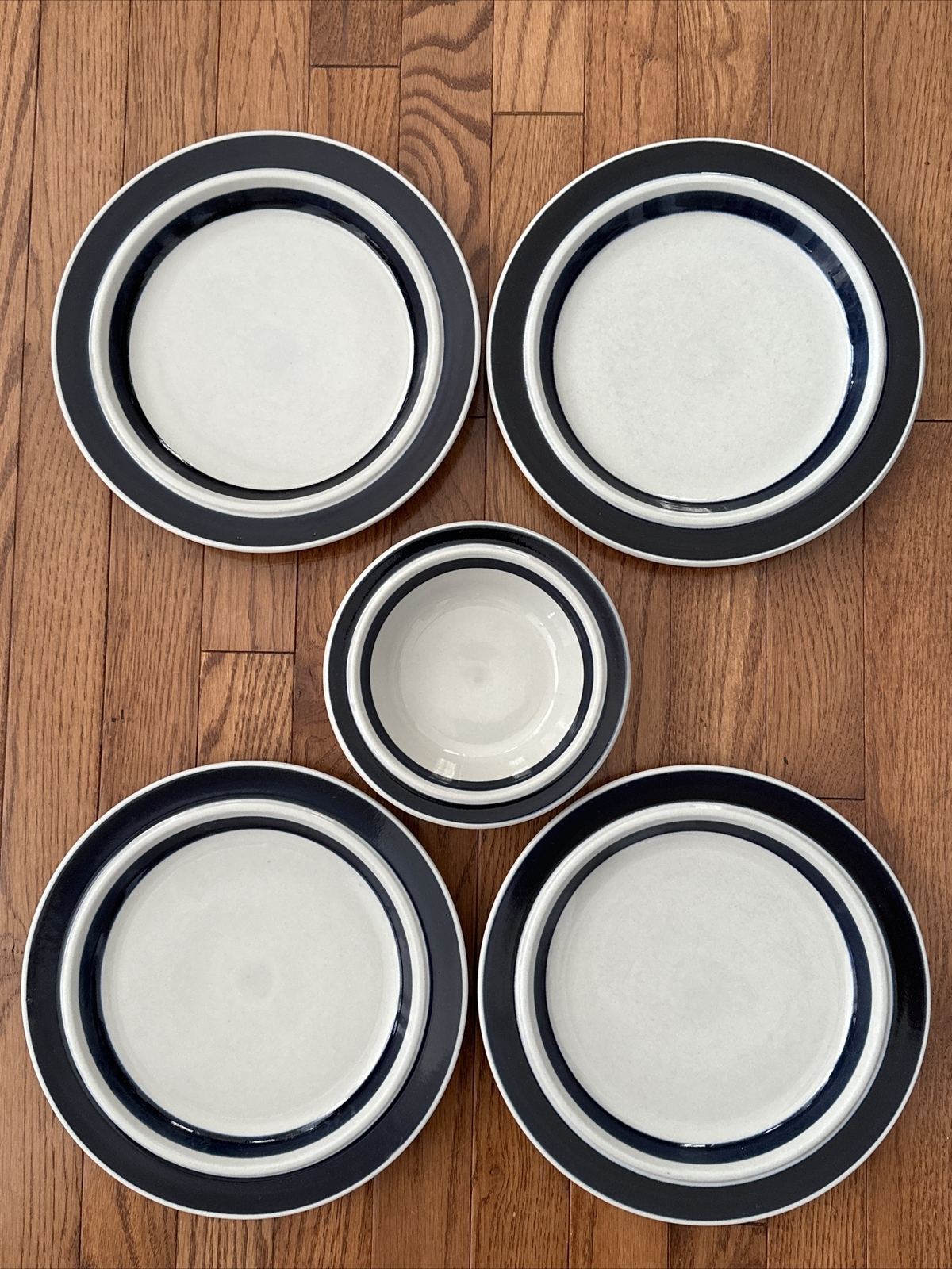Description: ARABIA FINLAND ANEMONE BLUE 4 DINNER PLATES SET 10″ & 1 Cereal Bowl” Please look at pictures up close Pictures are part of the description Preowned, good used condition The underside foot of 2 plates are chipped, pic 7&8 Dinner plate diameter 10-1/8” Cereal bowl diameter 7” THANK YOU for looking!