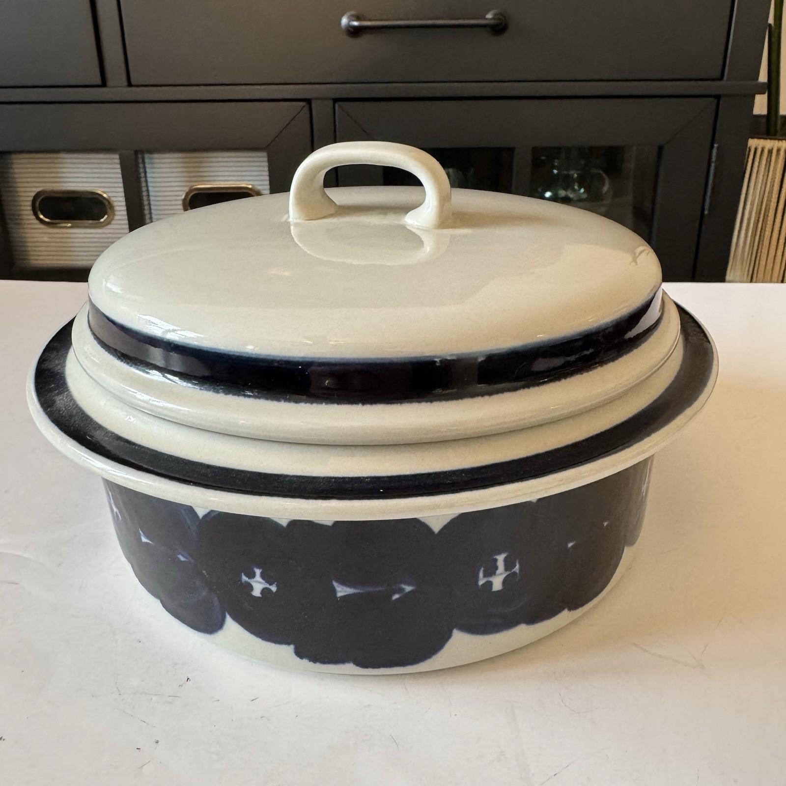 Description: The Arabia Finland Anemone Blue Covered 9″ Round Casserole Dish with Lid from the 1960s is a vintage piece of decorative cookware that adds a touch of retro charm to any kitchen. This stylish casserole dish features a round shape and a beautiful blue color, making it perfect for serving and storing meals. With its mid-century design and quality construction, this casserole dish is a must-have for collectors and those seeking unique and stylish cookware for their home. Preowned, very nice vintage condition