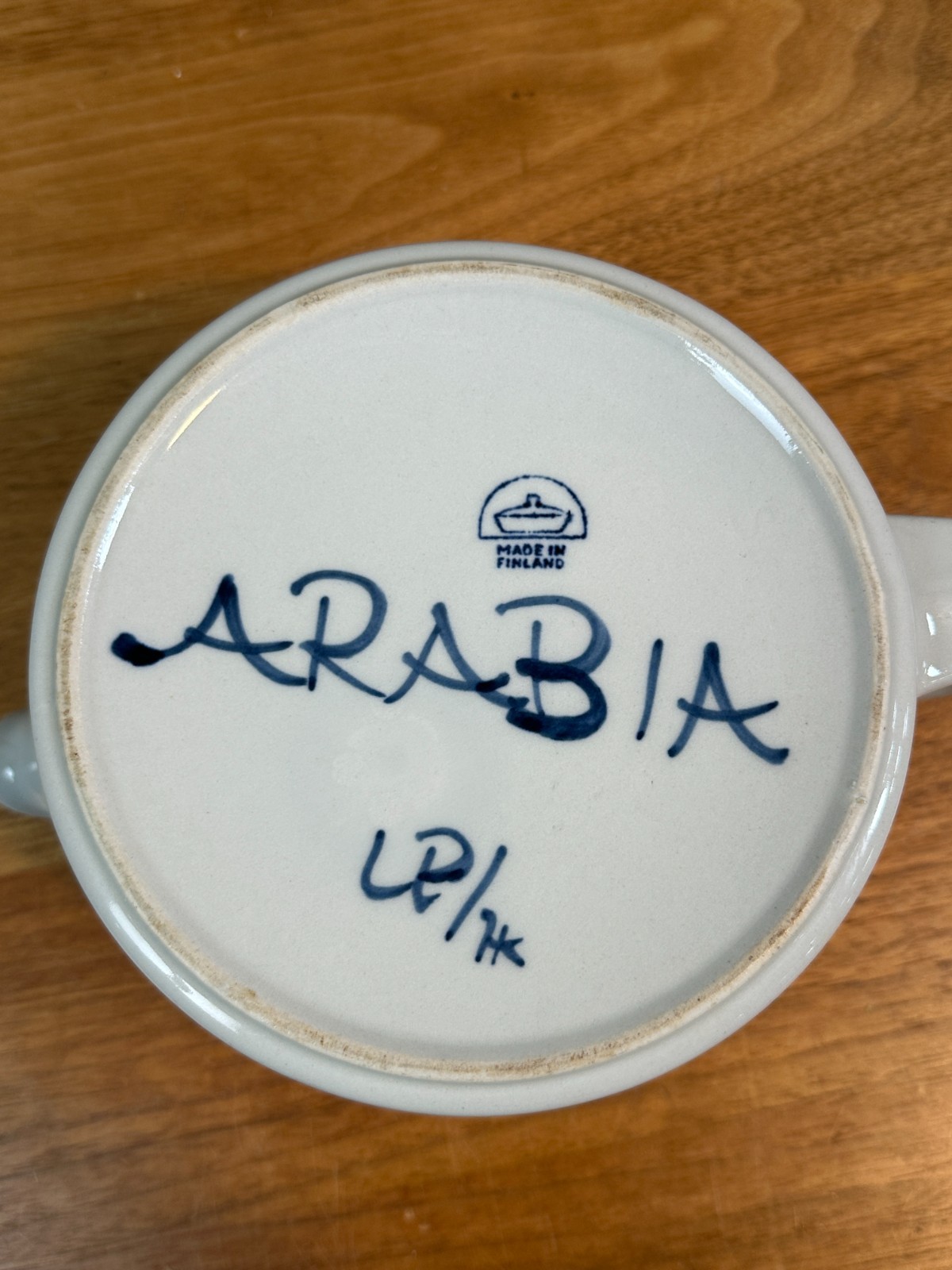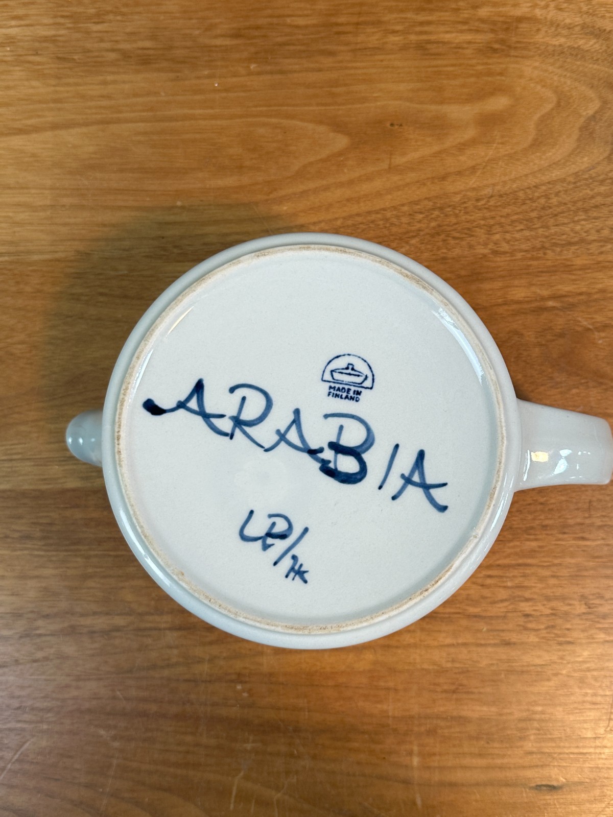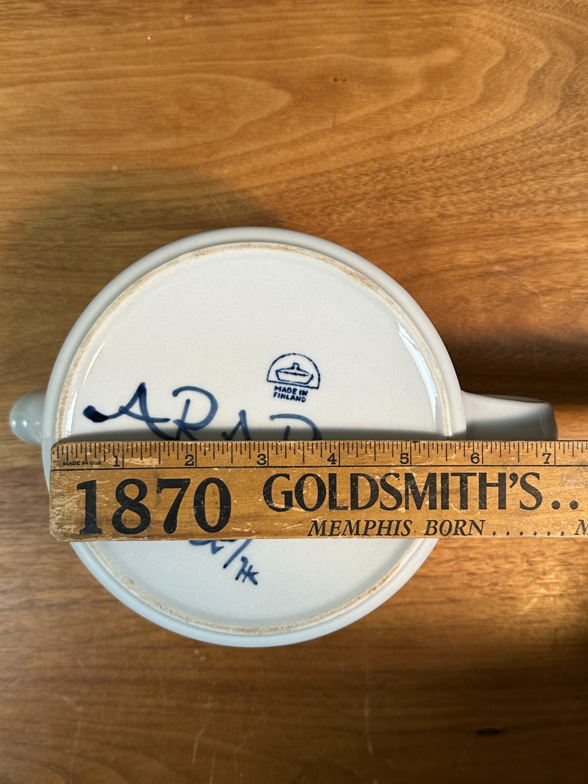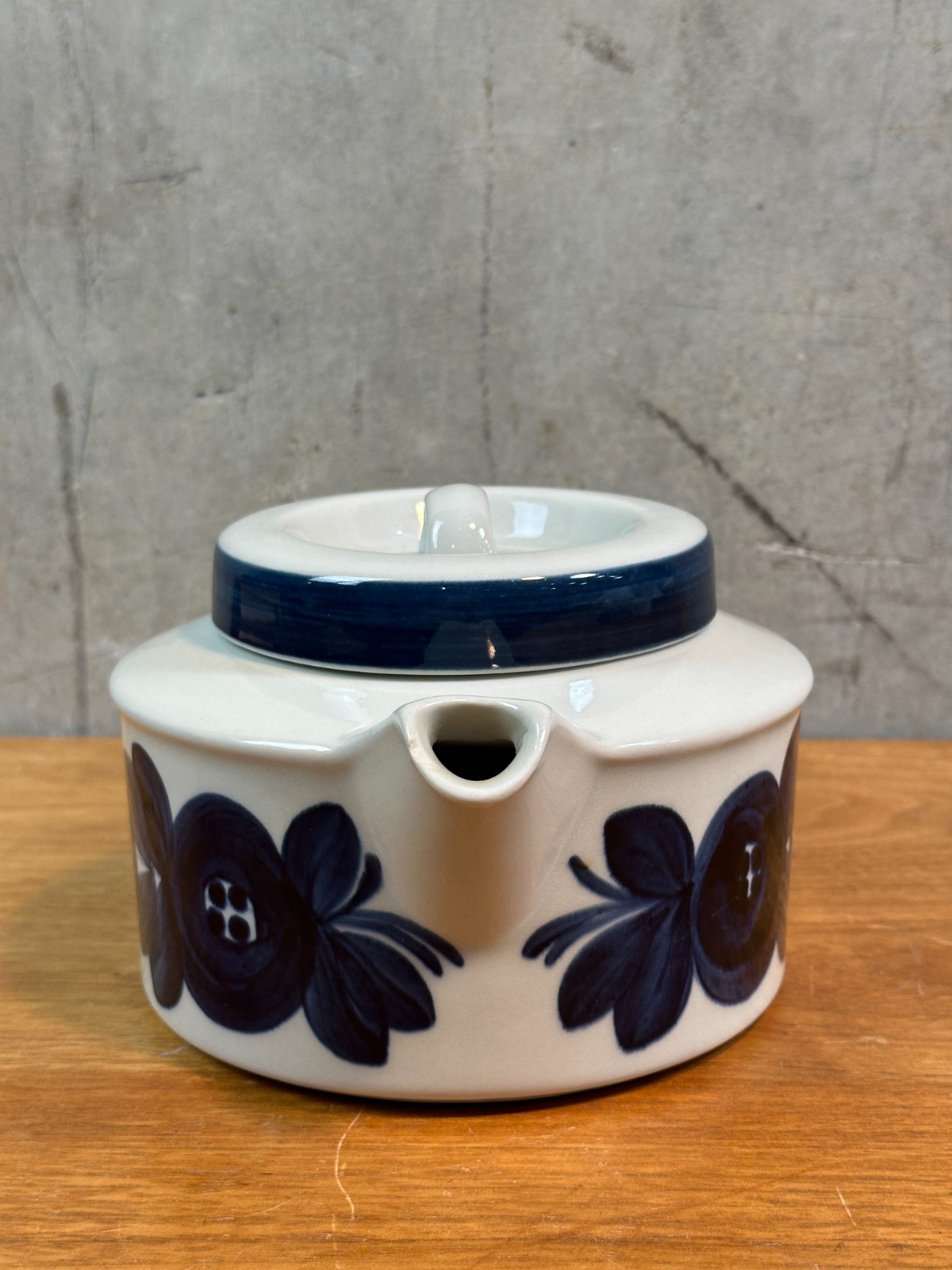 Description: This teapot features a stunning, hand-painted-likecobalt blue floral pattern —the signature “Anemone” design—on a pure white stoneware body. The underside has the hand-painted “ARABIA” mark, confirming it is an older piece from the Helsinki factory.
