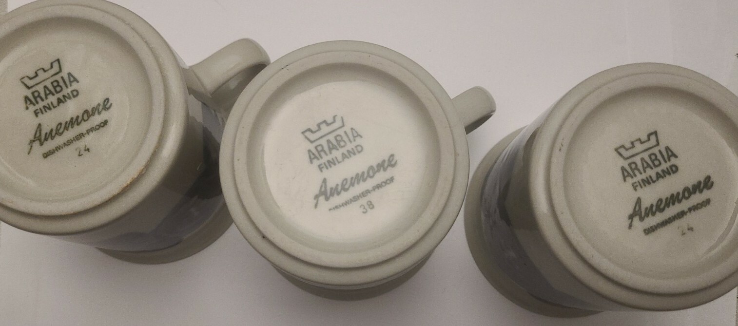 Description: Arabia Finland Blue Anemone Coffee Cup Set Of 2 By Ulla Procope Flower MCM. YOU ARE PURCHASING TWO CUPS/MUGS. We have 6 total at tome of listing and selling two at a time. All are a little different because they are hand painted. All are in good shape as shown in pictures. SO PLEASE. SEE PICTURES FOR CONDITION BECAUSE THIS IS AN AS IS SALE WITH NO RETURNS