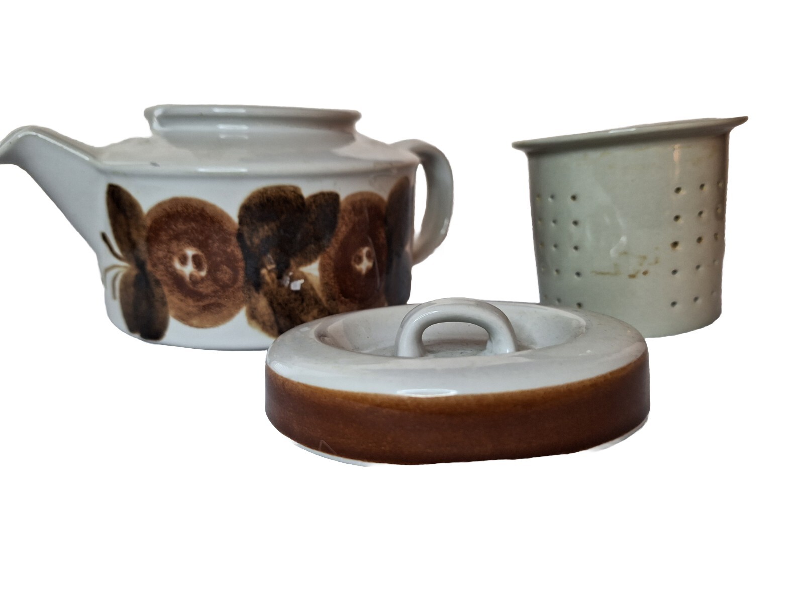 Description: This Arabia tea pot set is a beautiful addition to any kitchen or collection. The set includes a strainer, lid, and 3-piece pot in a lovely brown color with a pattern. Made with porcelain, stoneware, and ceramic materials using pottery techniques in Finland, this set is a unique and high-quality find. The product line is Anemone and is Ulla Procope. Perfect for any tea lover or collector, this set is sure to impress.