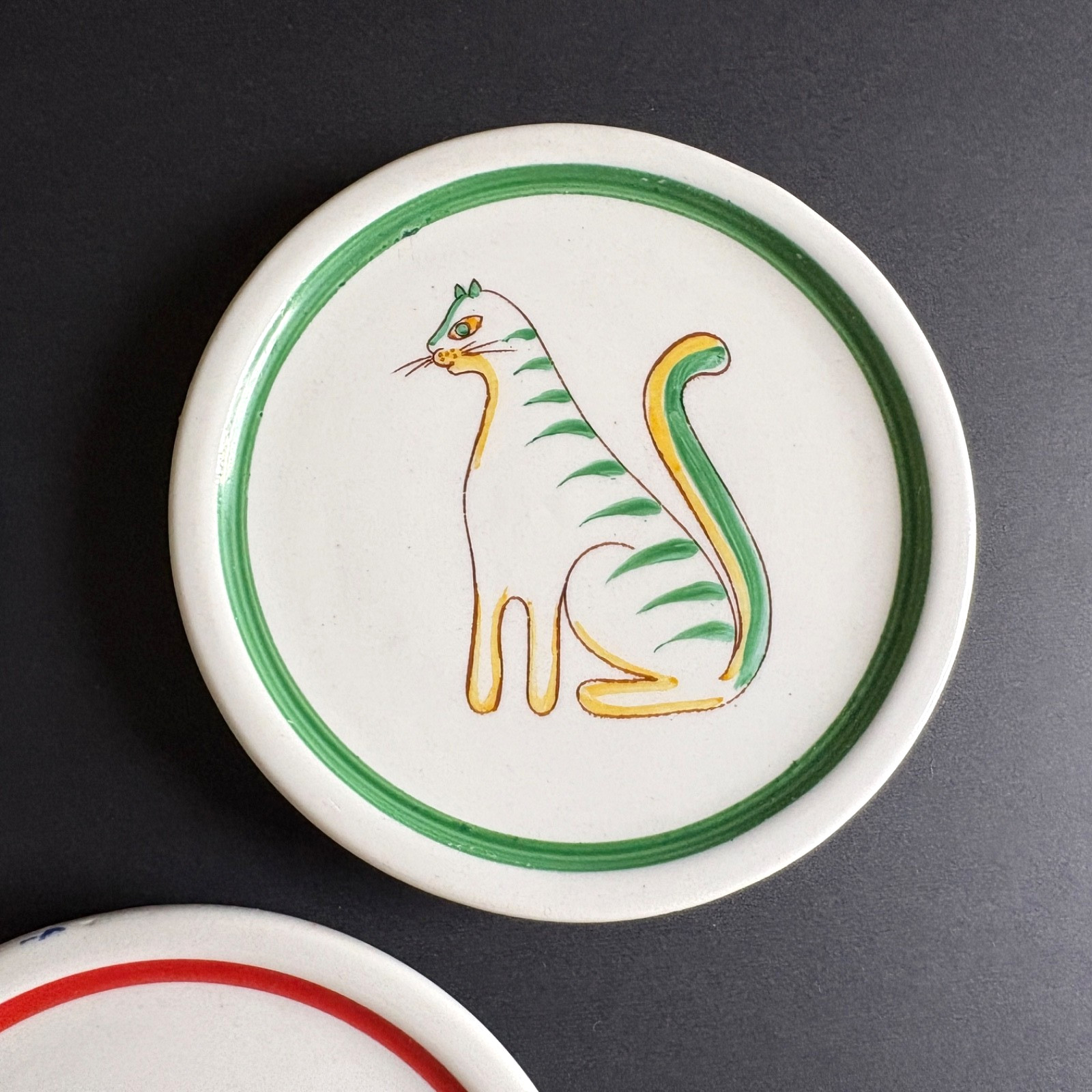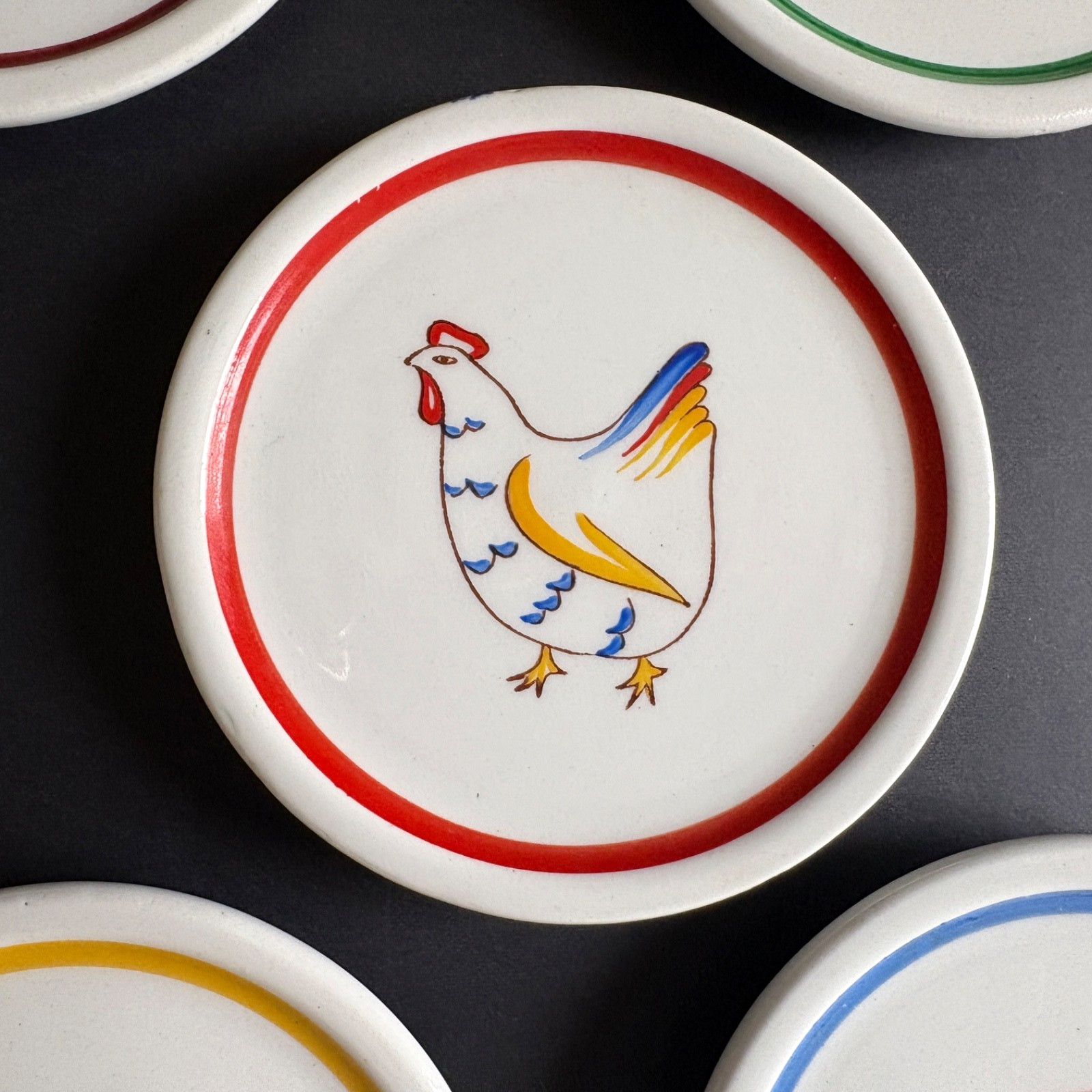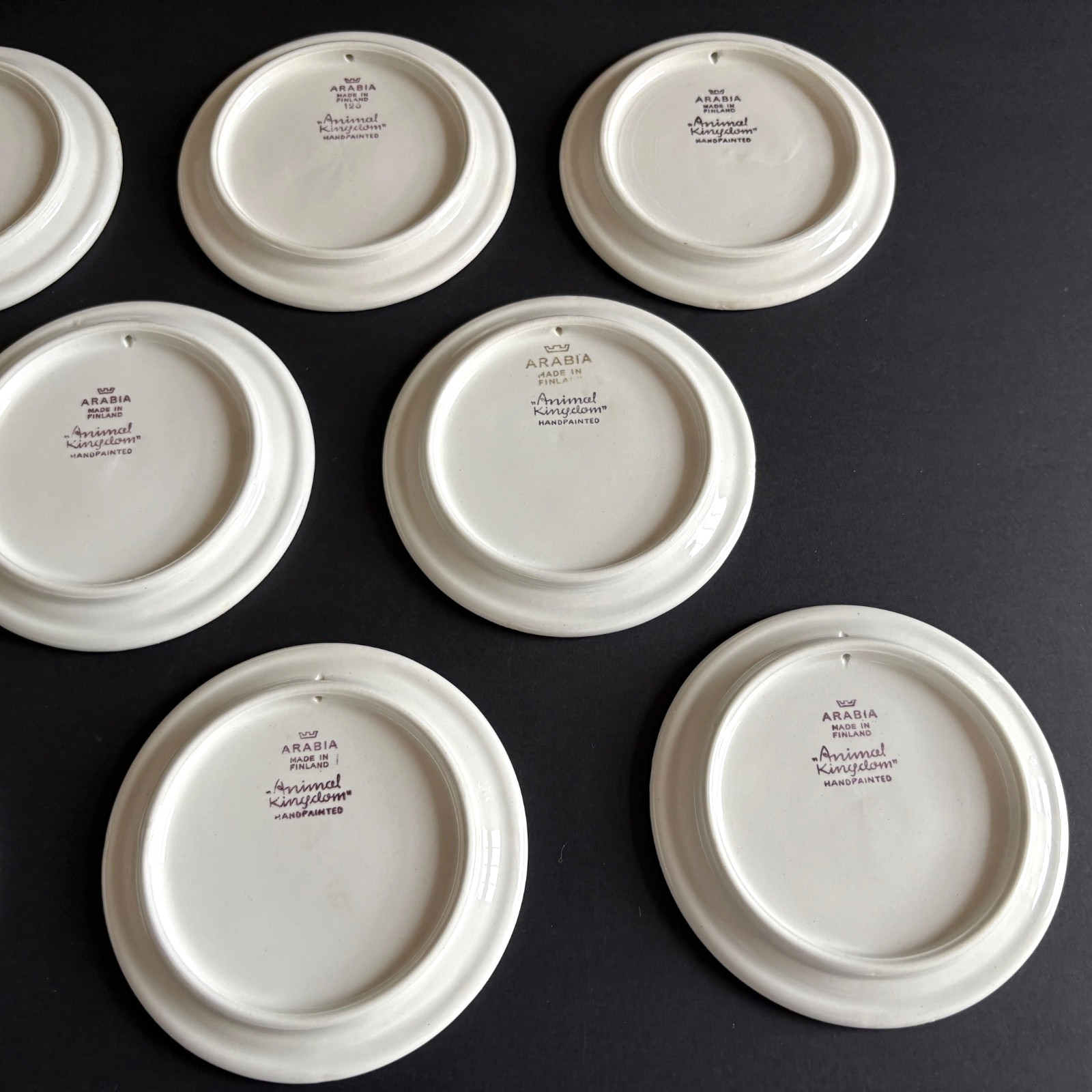 Description: ARABIA, Made in Finland. “ANIMAL KINGDOM,”. 4 1/4″ Plates. There are the usual glaze misses on the sides, here and there. And, as seen, there is a blue paint mark at the top of the Chicken plate. These are made with holes on the back sides for hanging.