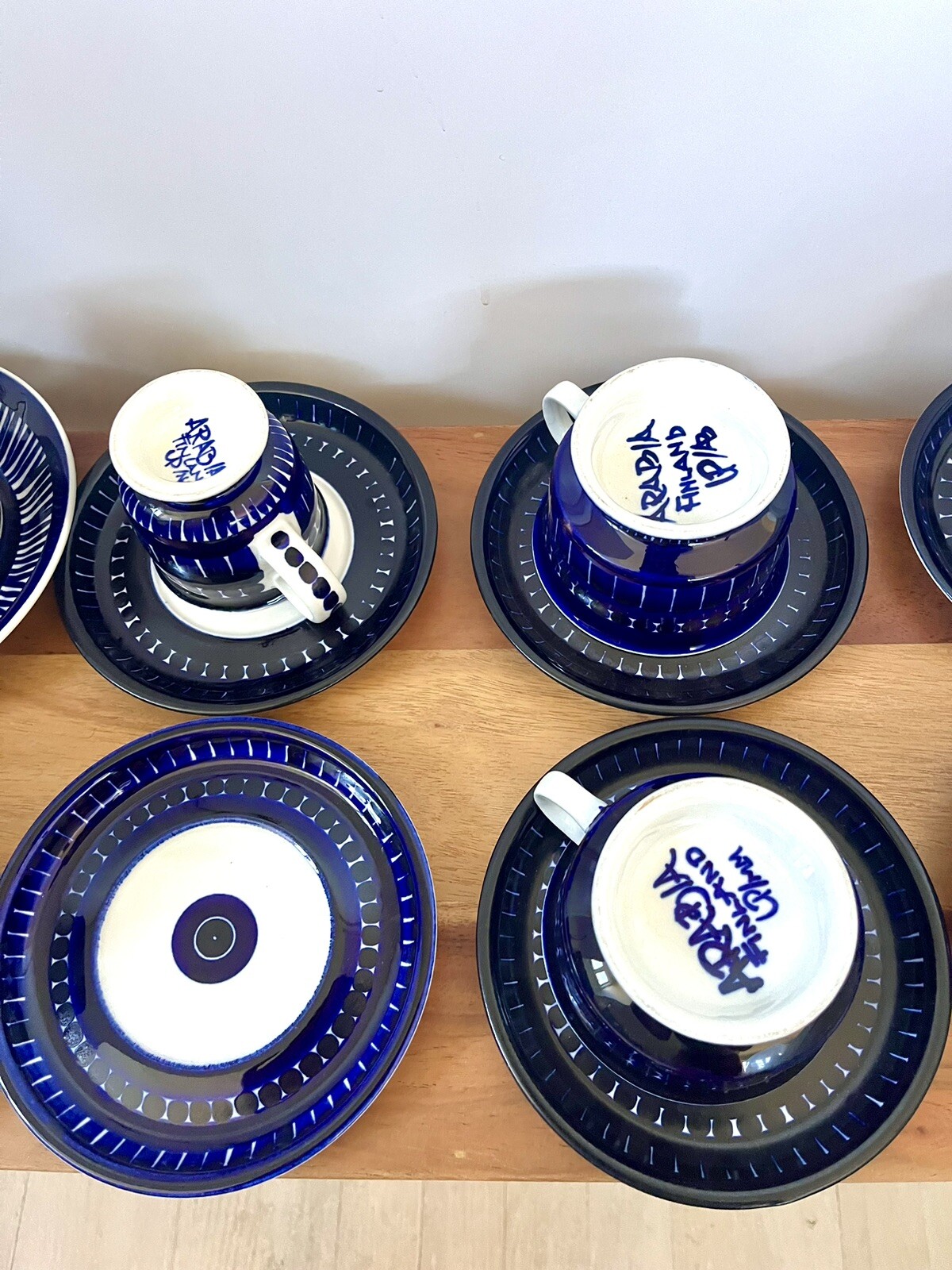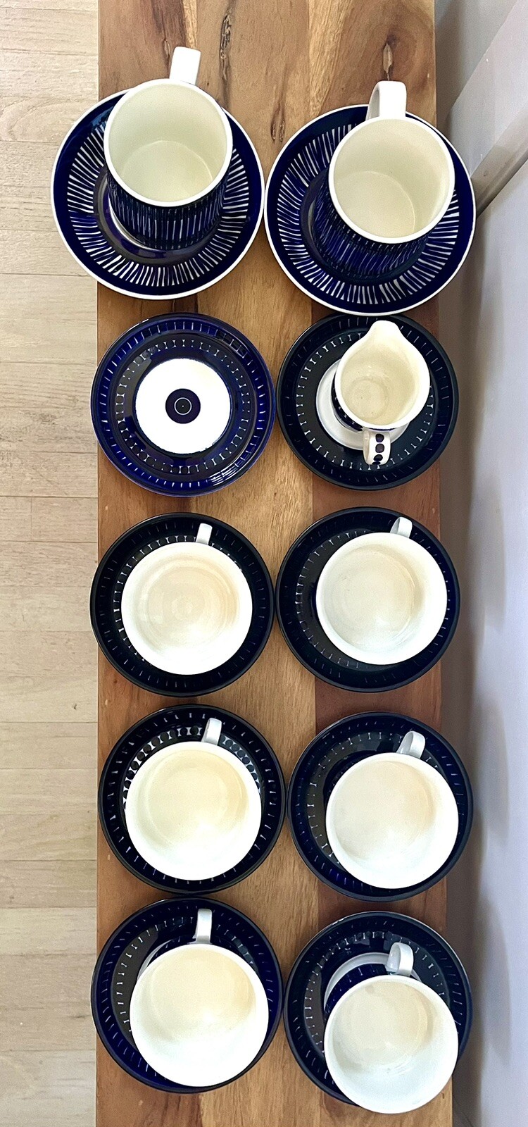 Description: Absolutely gorgeous set! There are 10 saucers, 2 larger mugs, one creamer cup, and 6 of the smaller mugs, so 19 items total in the set. They are all mint condition with the exception of one saucer that is chipped (shown in the last photo.) otherwise the rest of the pieces have no flaws