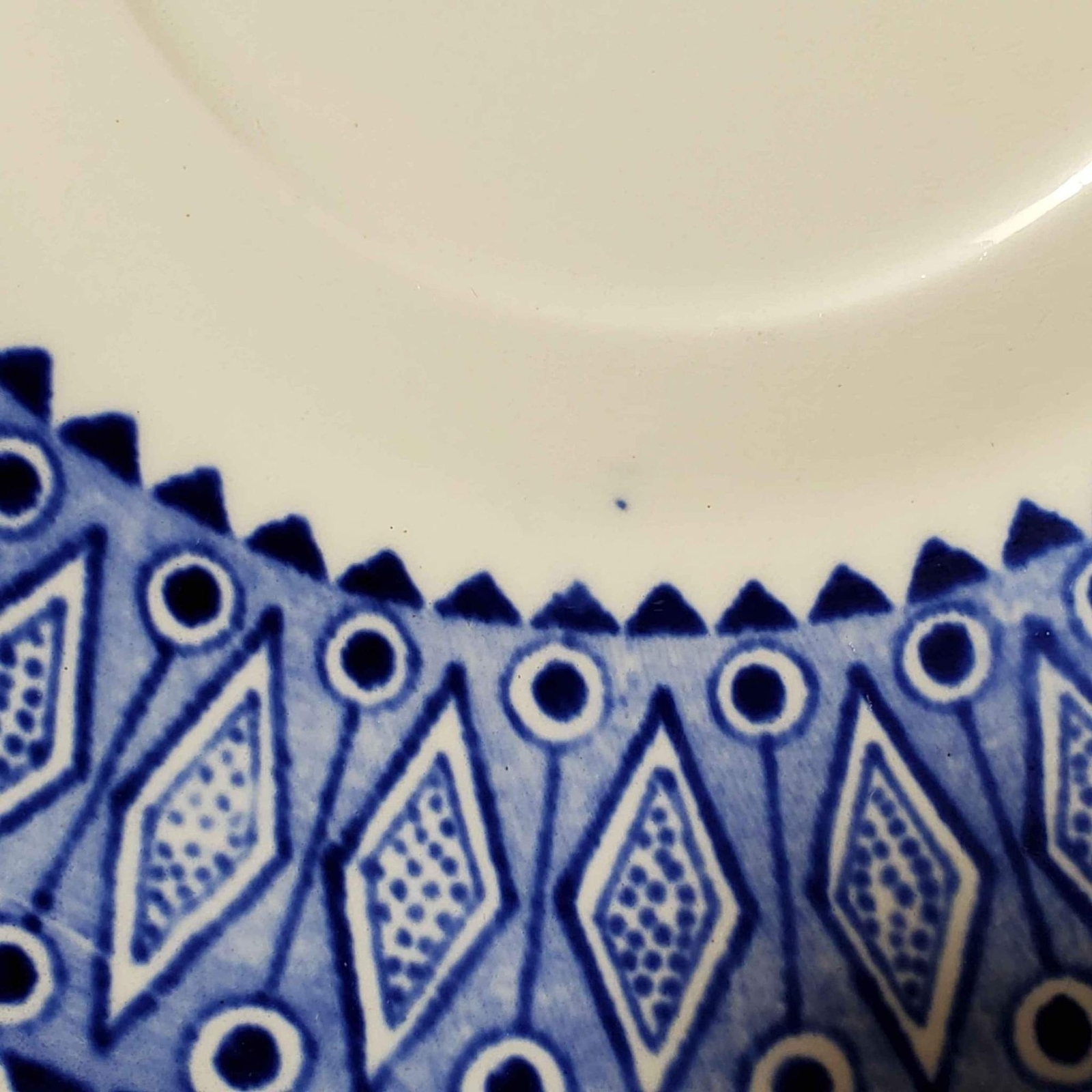 Description: Vintage Arabia demitasse teacup and saucer. Blue and white geometric pattern. Made in Finland. Teacup is approximately 2.25″ tall and saucer is approximately 5.25″ across. Blue spot under glaze on saucer.