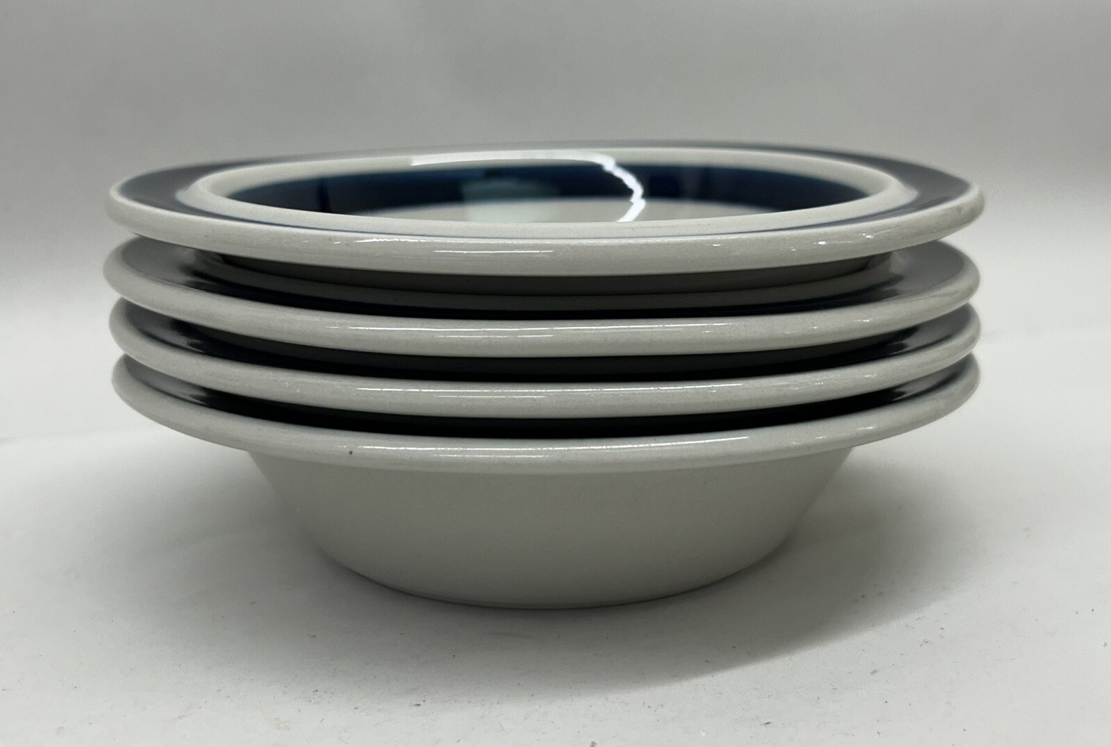 Description: Arabia Finland set of 4 Anemone blue rim cereal or soup bowl, 7″ by Ulla Procope. Good condition with only light signs of normal use, no chips, cracks, big scratches.