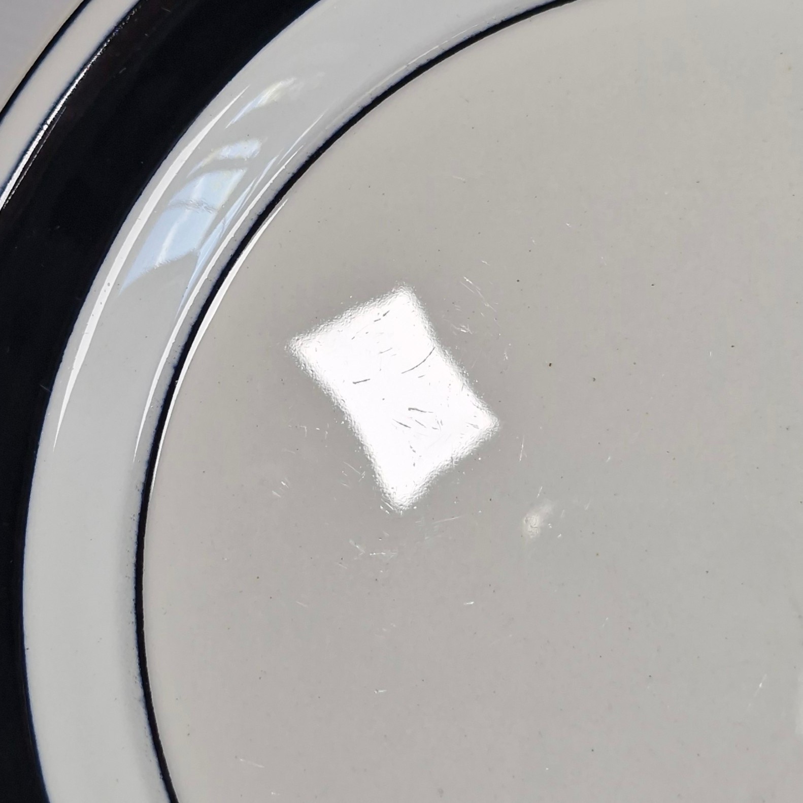 Description: This sale is for 6 plates sold together as a set. Surface utensil wear from use, especially noticeable when looking closely in strong light. Wear on the black printed rim will be noticed during use.