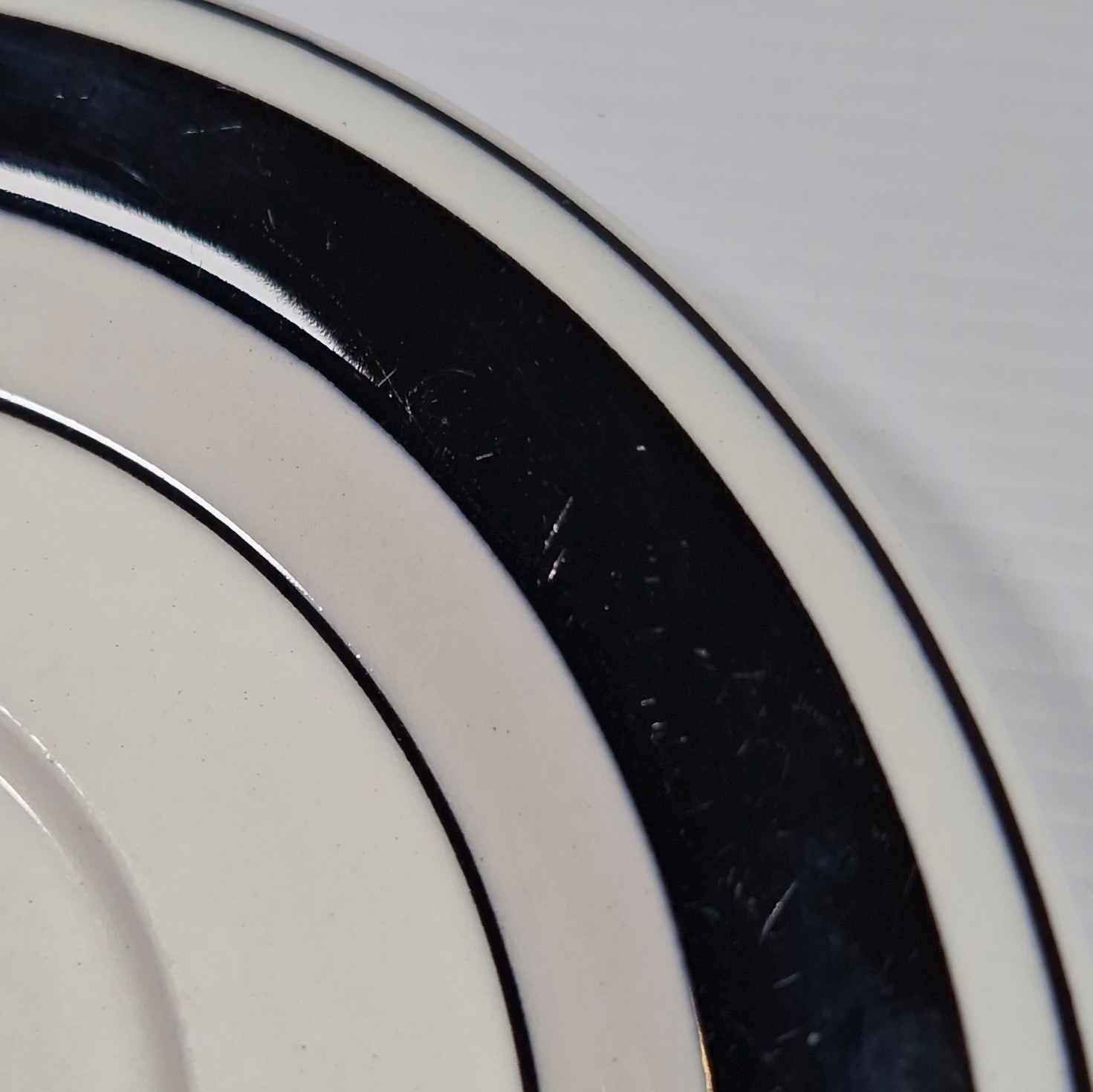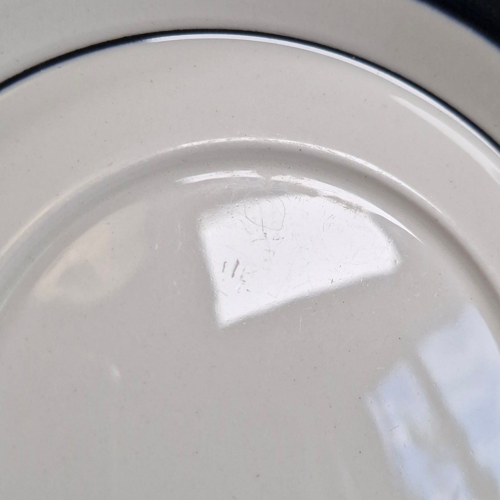 Description: Surface utensil wear from use, especially noticeable when looking closely in strong light. Wear on the black printed rim will be noticed during use.