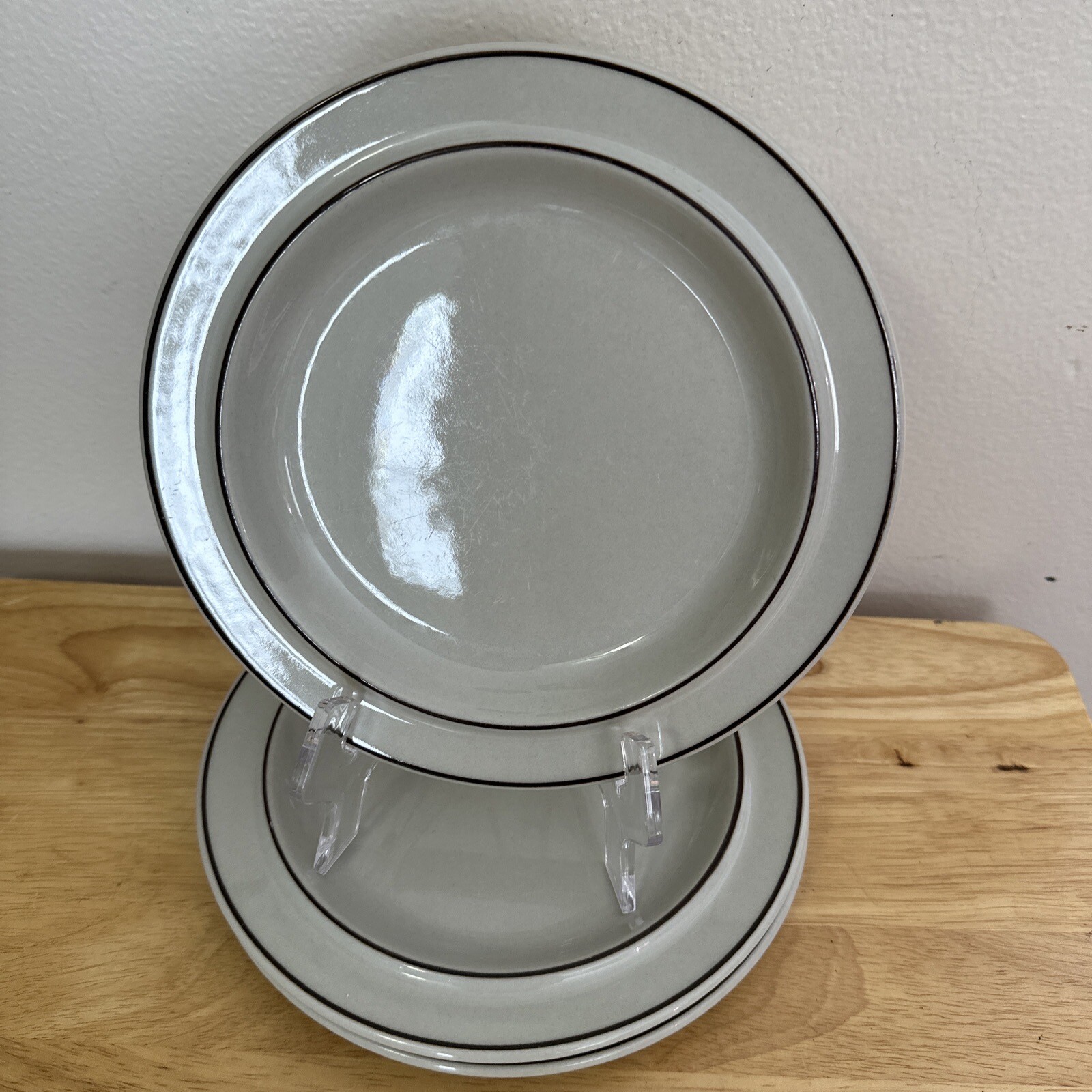 Description: Introducing a set of three Arabia-Finland “FENNICA” bone tab/brown bands 8″ bread plates. These vintage plates are round in shape and have a European theme. They are made of ceramic material and come in a set that includes a dessert plate and a bread plate. The plates are colored in tan/brown and have a lip feature. They were manufactured in Finland in the time period of 1970-1979 and have a printed backstamp. These plates are perfect for decorative cookware, dinnerware, and serveware. Get your hands on this unique set of plates now! Preowned in great condition with light fork marks no chips or cracks