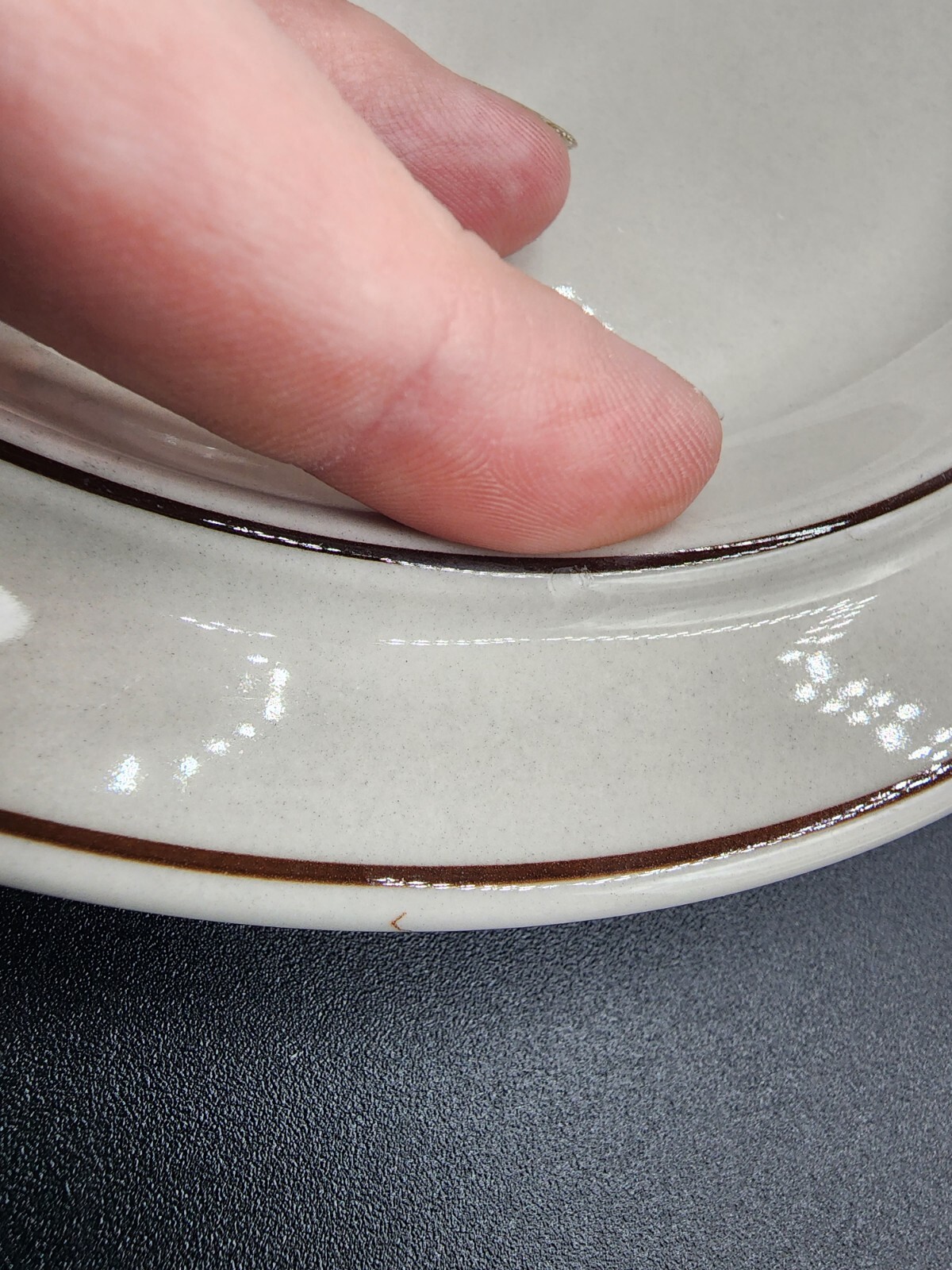 Description: Under plate / Salad Plate – 7 1/2” has a small chip just of the glaze, see photos. Bowl sits Snuggly on top of plate.