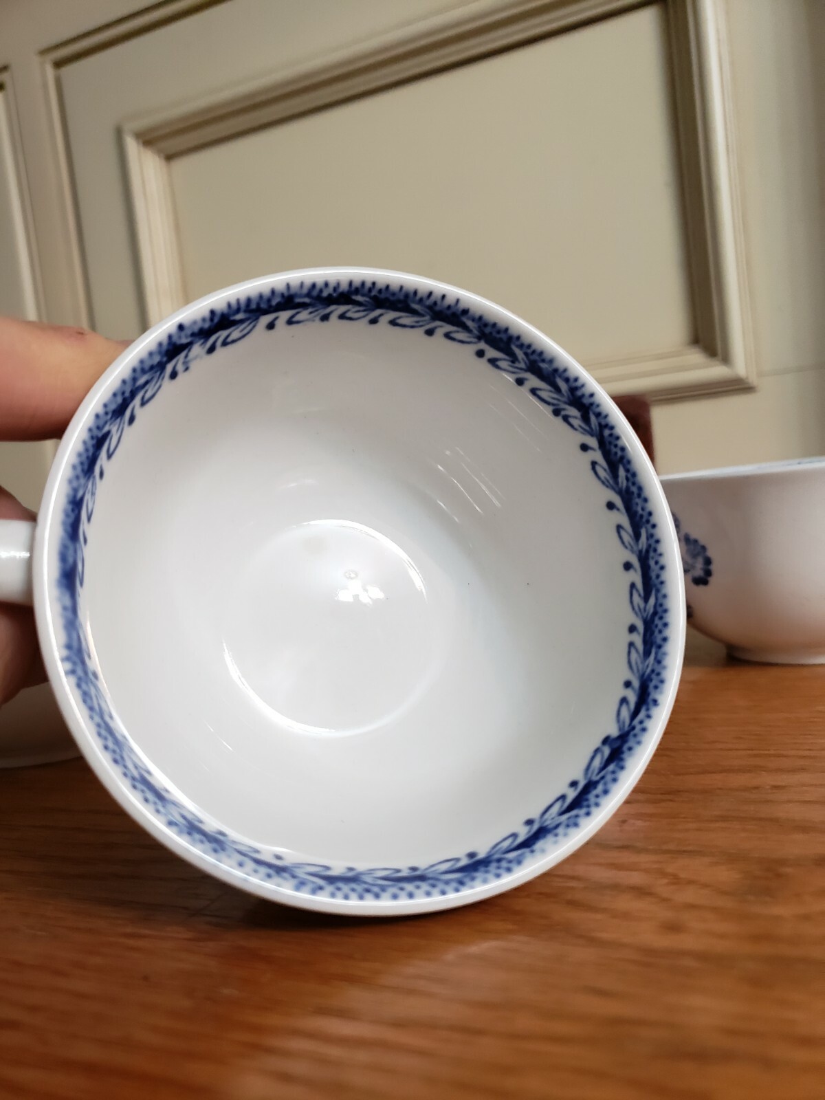 Description: ONE HAS ROUGH SPOT AND MANUFACTURE TINY STRESS CRACK AT BOTTOM. NO CRAZING INSIDE VERY VERY CLEAN. ONE HAS A SMALL CHIP END TAIL OF HANDLE. ONE LOOKS GREAT. ONE HAS RIM CHIP.