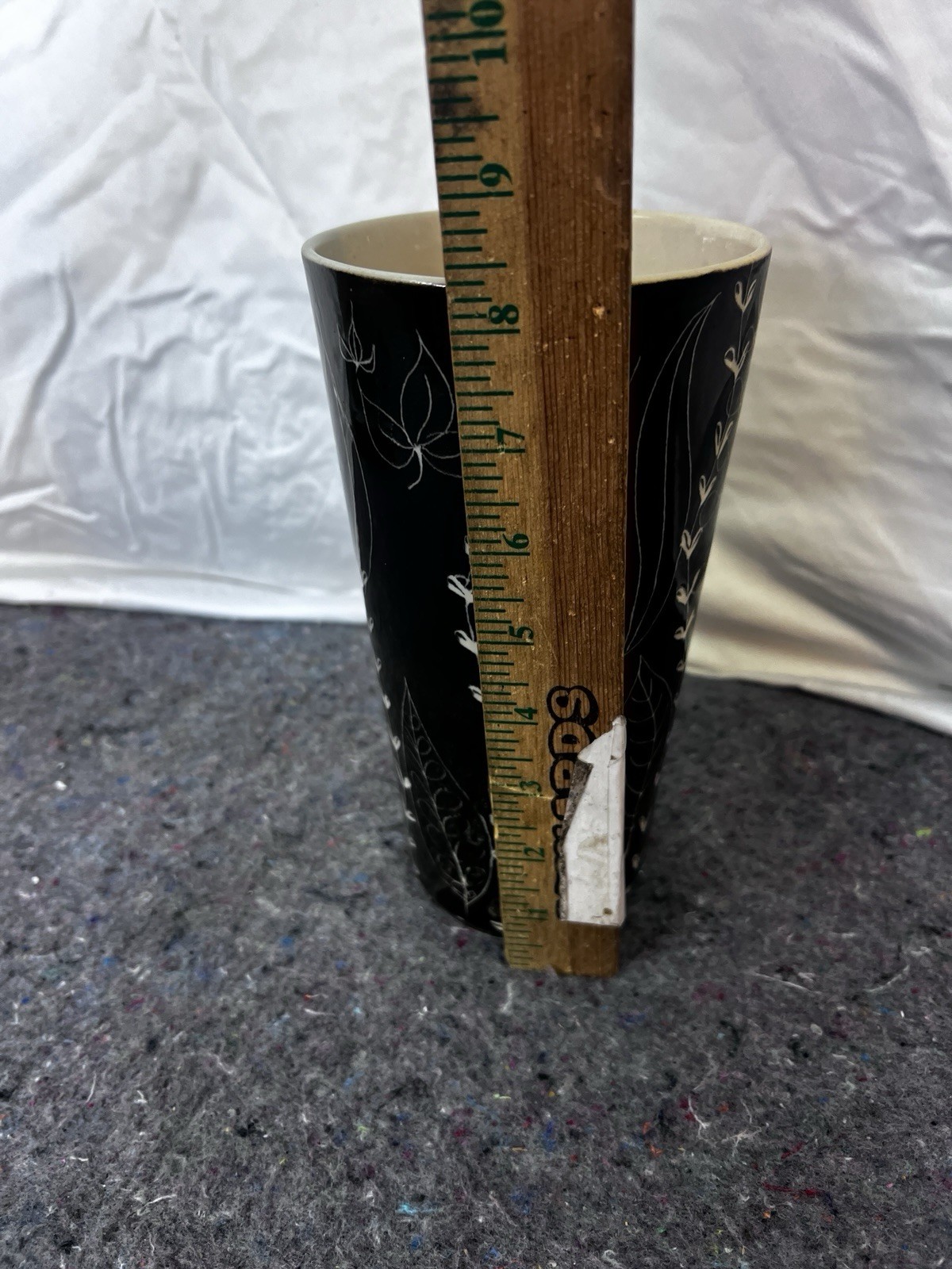 Description: Arabia Finland 8” Tall Flowers & Leaves Pottery Vase Black & White. Condition is Used. Shipped with USPS Ground Advantage.