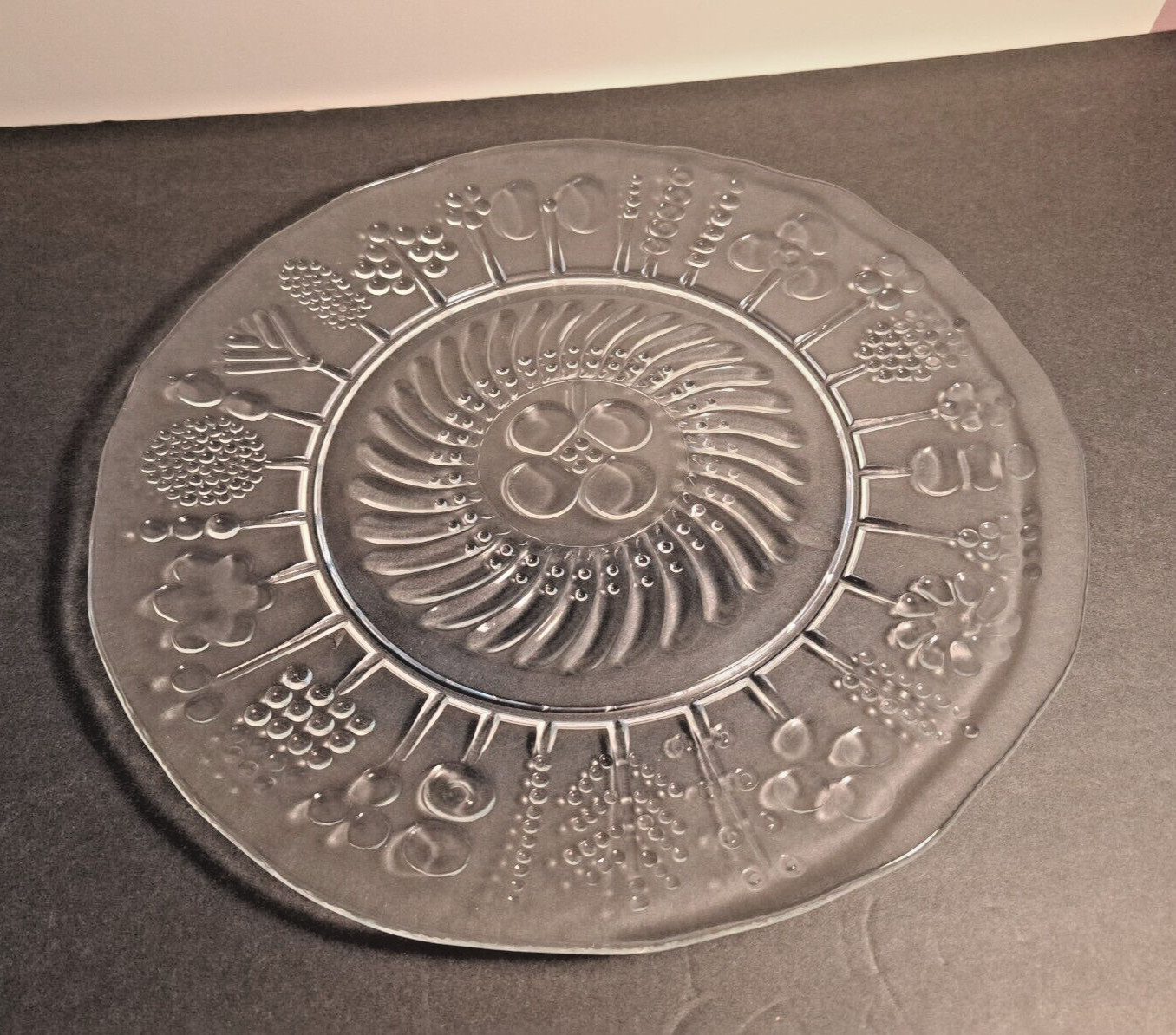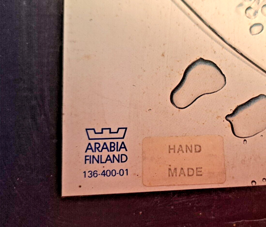 Description: Add a touch of elegance to your dining table with this stunning serving platter from Arabia Iittala Nuutajarvi designed in 1966 by Oiva Toikka. The platter has an embossed design and a glossy finish, making it a perfect addition to your collection of decorative cookware, dinnerware, and serveware.