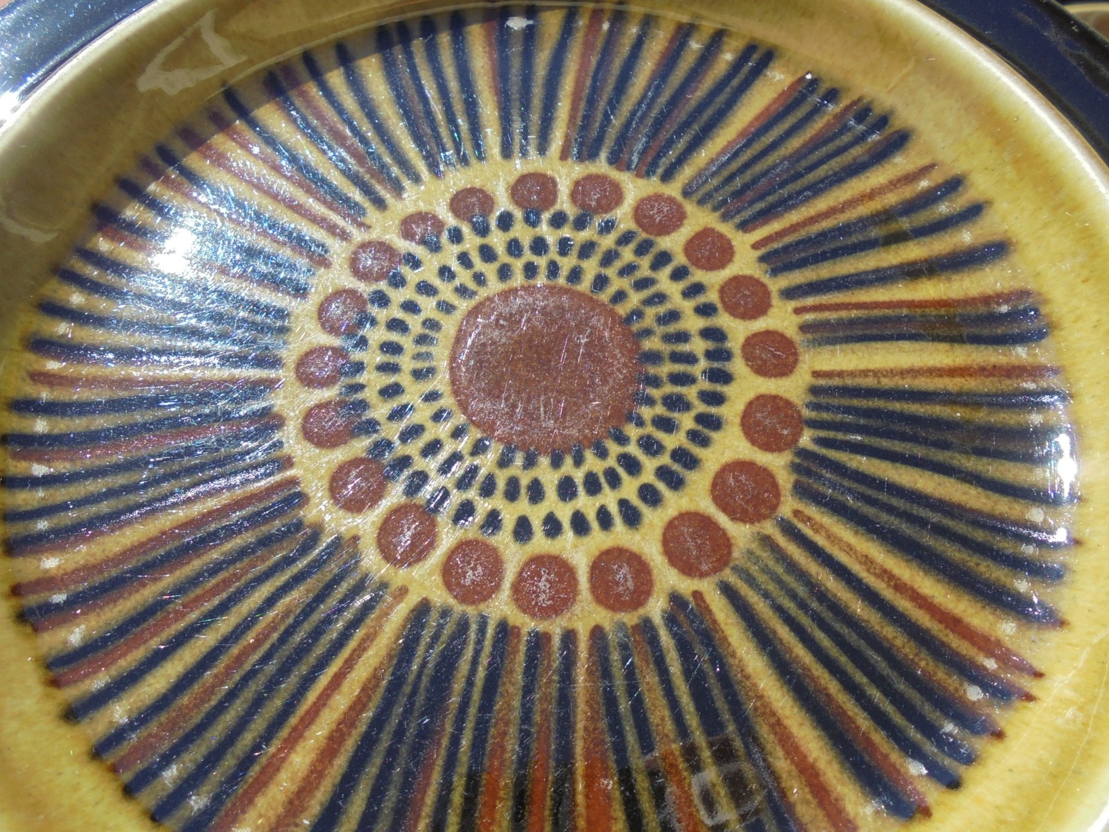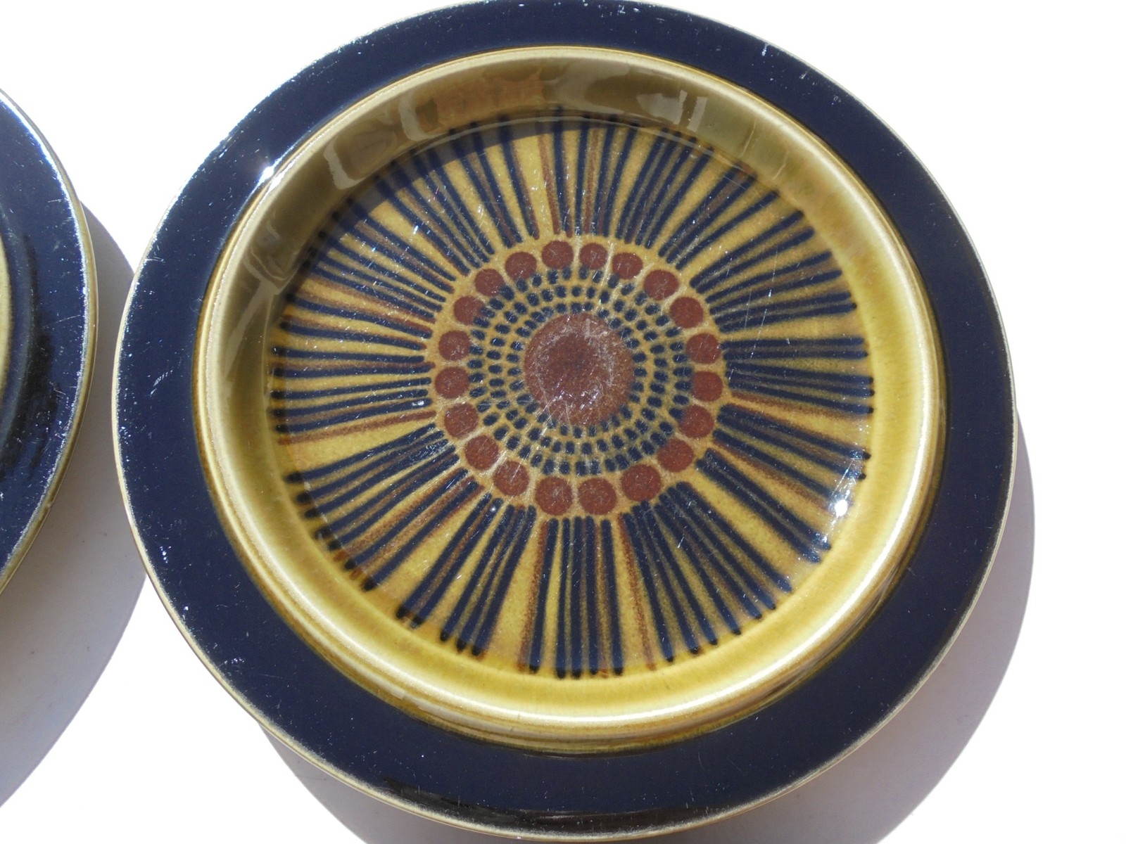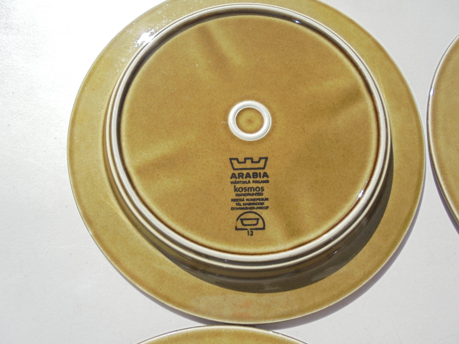 Description: Here is a very attractive set of four Arabia Finland Kosmos dinner plates. They are all in very good used condition. Three of the plates have an area of smoothing or grinding to footrim on underside, nothing that really affects use or appearance.