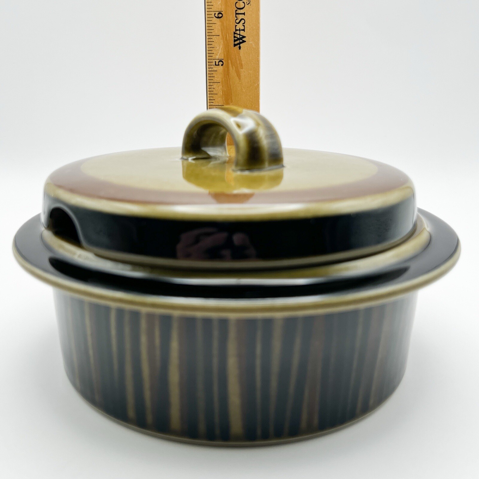 Description: Pattern is Kosmos. Arabia Finland 1 QT Lidded Casserole Dish [Mid Century Modern].