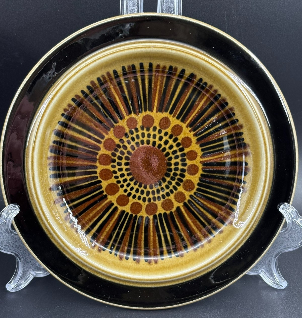 Description: Designer: Gunvor Olin-Grönqvist. Pattern: Kosmos. Backstamp: “KOSMOS ARABIA Made in Finland” (see photo). Maker: Arabia, Finland. Quantity: 8 plates.