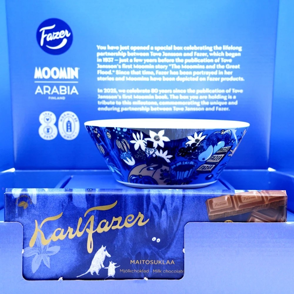 Description: The box also includes a bar of Fazer chocolate (best before 31.7.2026) with a special Moomin designed wrap.