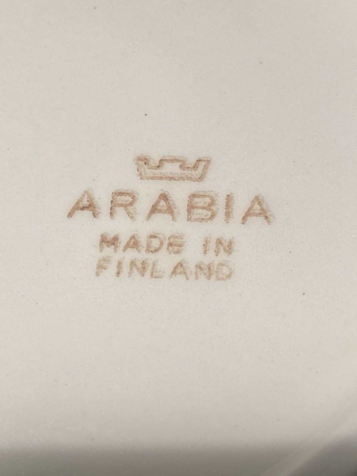 Description: This is a charming grouping of two plates and a shallow bowl by Arabia Finland. The design of these pieces is attributed by others to Anja Juurikkala who worked at Arabia from 1946-1960, but I can’t confirm these others are correct.