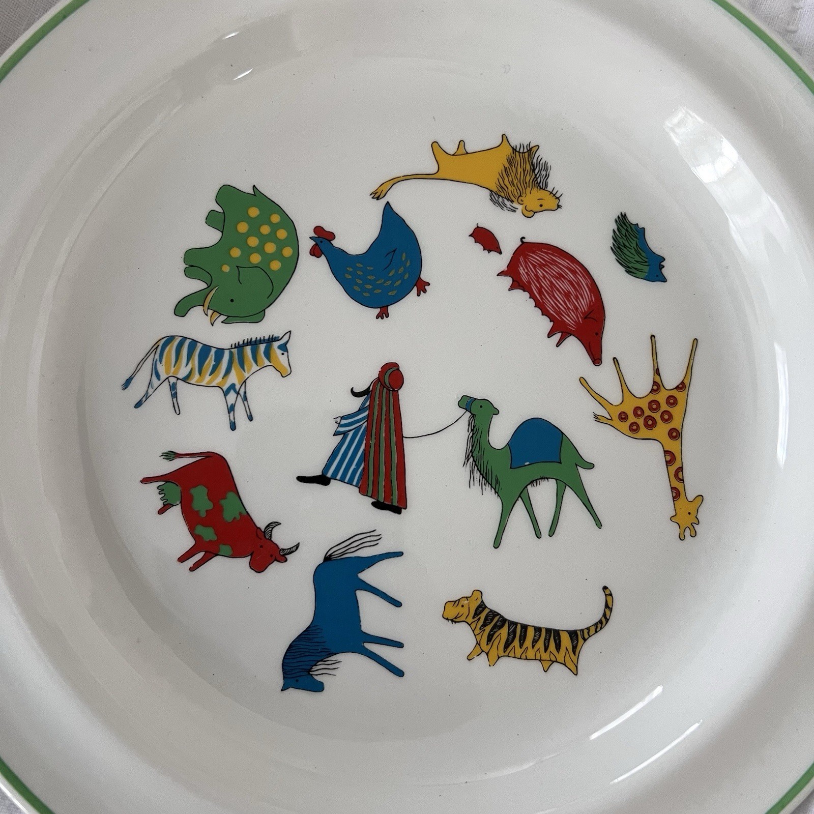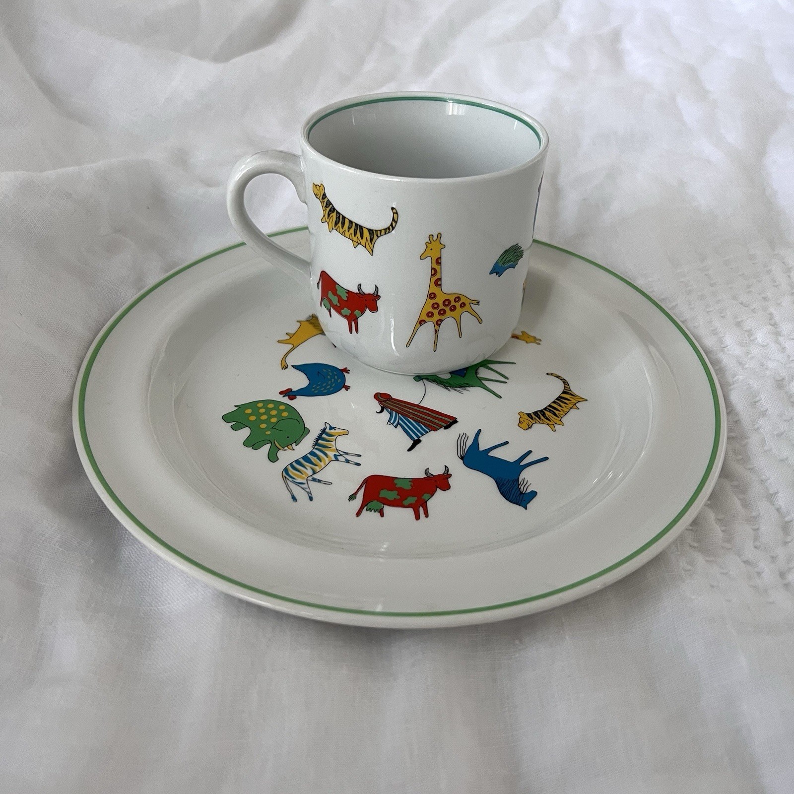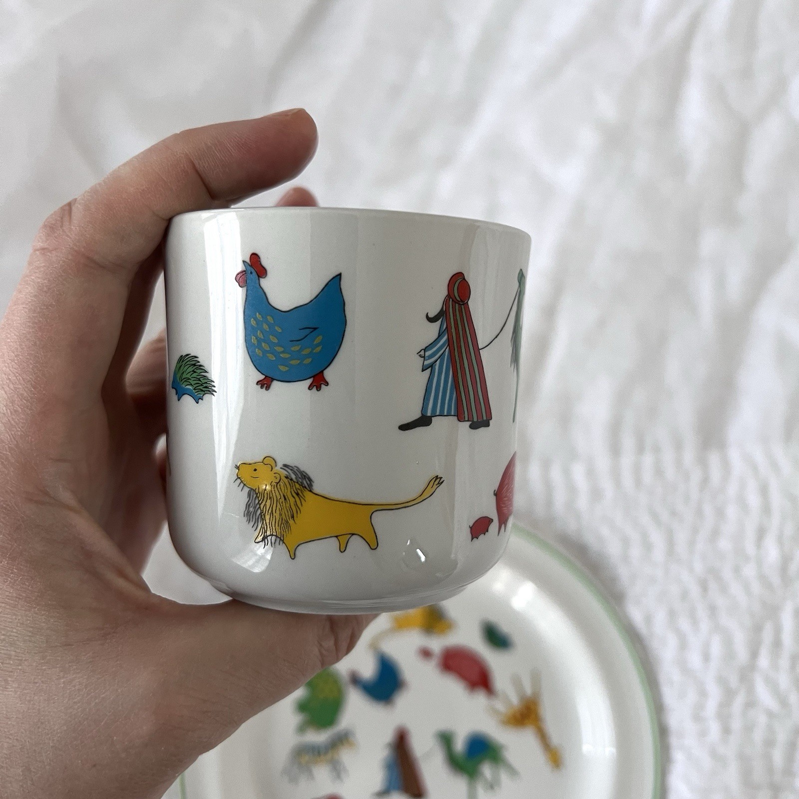 Description: DETAILS: • vintage mid century child’s tableware set designed by Anja Juurikkala with pattern of various animal illustrations & a green band • backs are stamped ARABIA MADE IN FINLAND MEASUREMENTS: • plate – 7.75” wide • mug – 3” tall & 3” wide CONDITION: Excellent vintage condition overall. Has a few pinpoint spots of wear on enamel and some fine hairline surface cracks in glaze along edge of plate (see photo). SHIPPING: $12.90