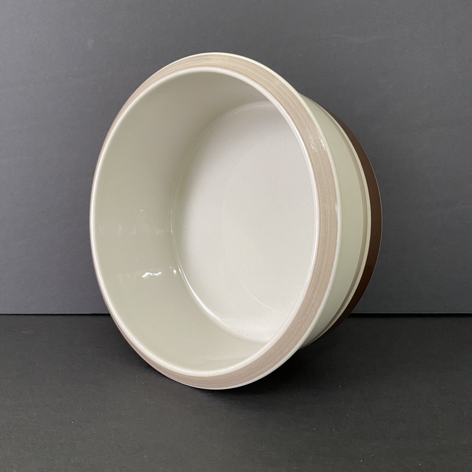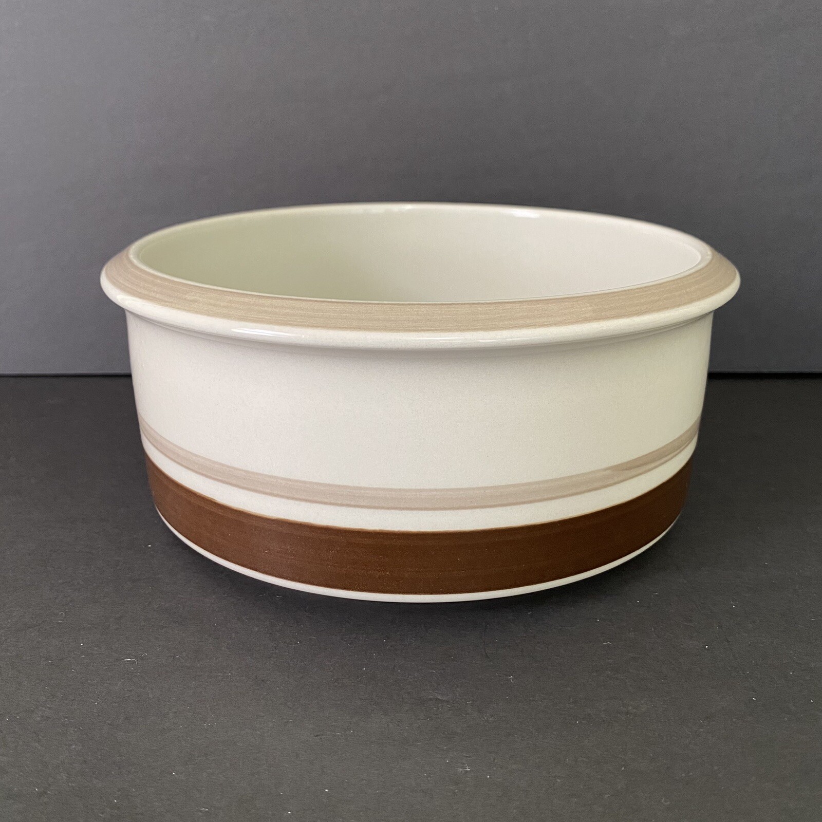 Description: Up for your consideration is an Arabia (of Finland) round vegetable bowl or serving bowl in the Pirtti pattern. The bowl is tan (beige) with a light brown stripe around the rim and light brown and dark brown stripes (bands) around the lower exterior.