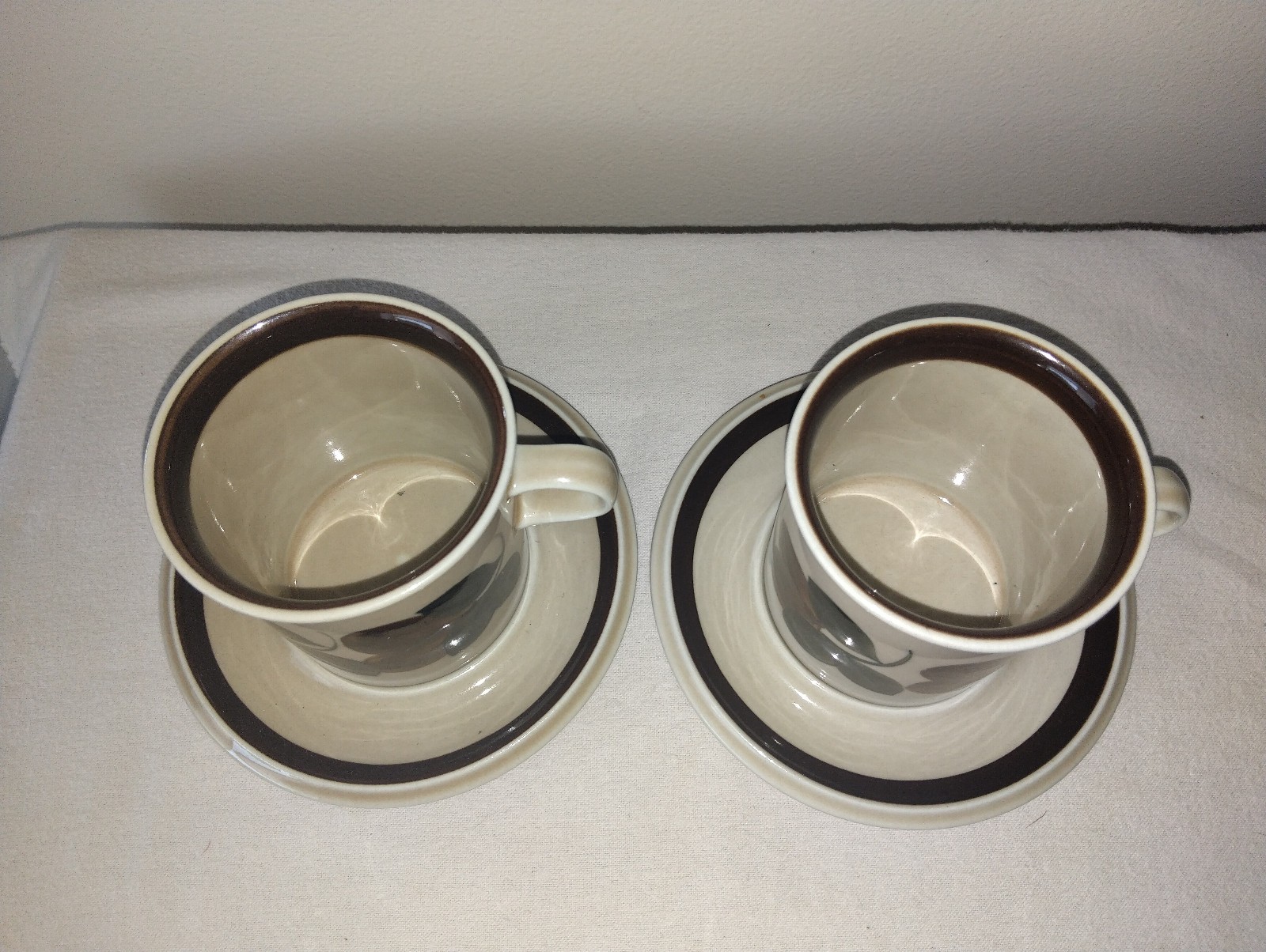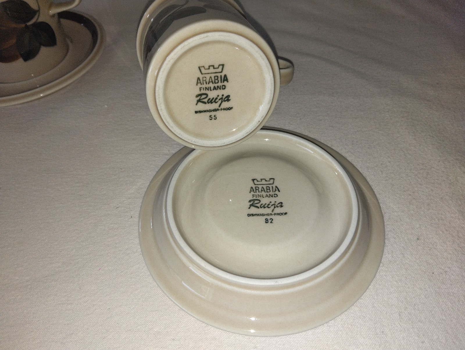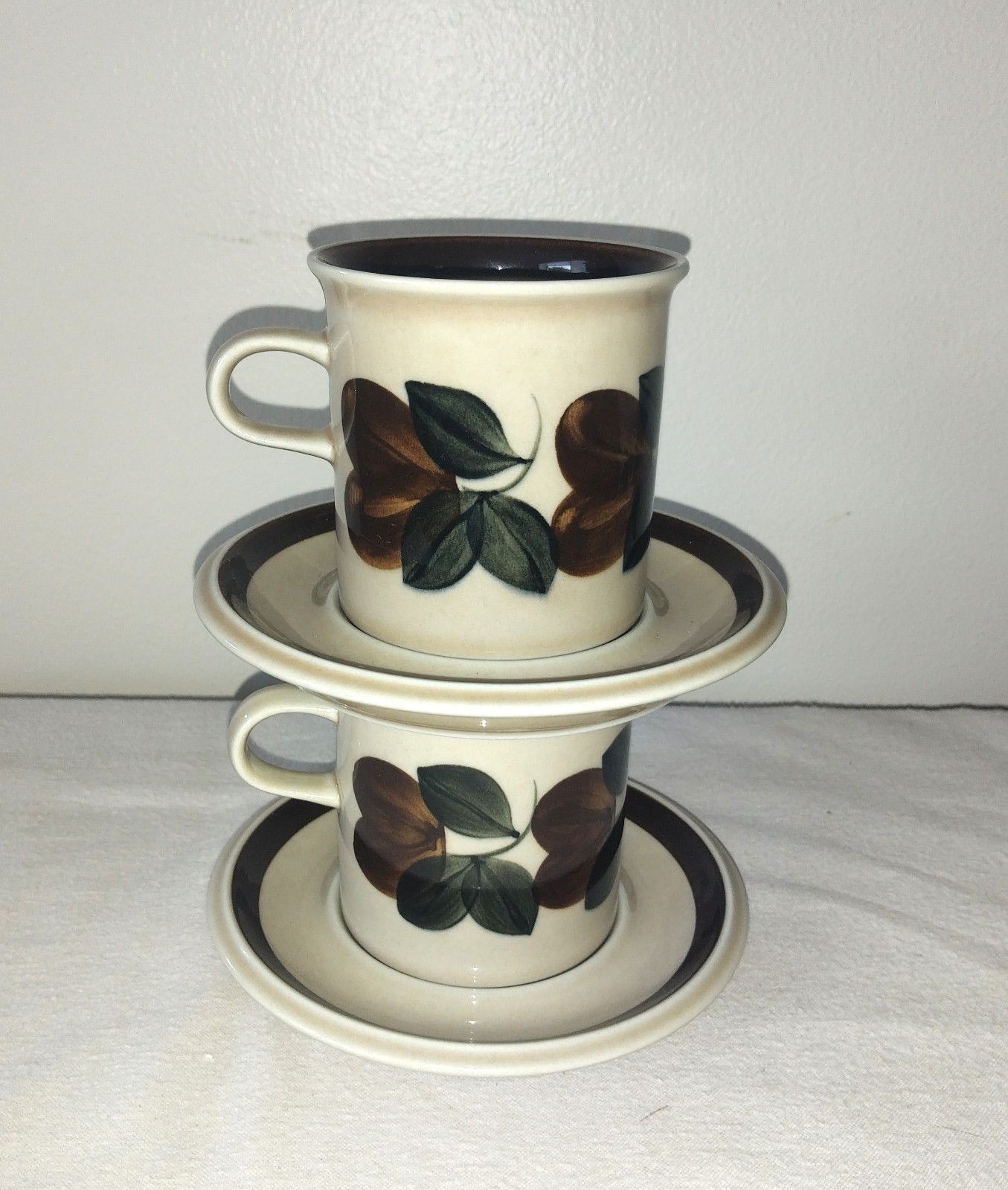 Description: Crafted in Finland between 1977 and 1981, these stoneware pieces feature a warm tan glaze with a fruit motif and rich brown bands. Each piece is hallmarked on the bottom.