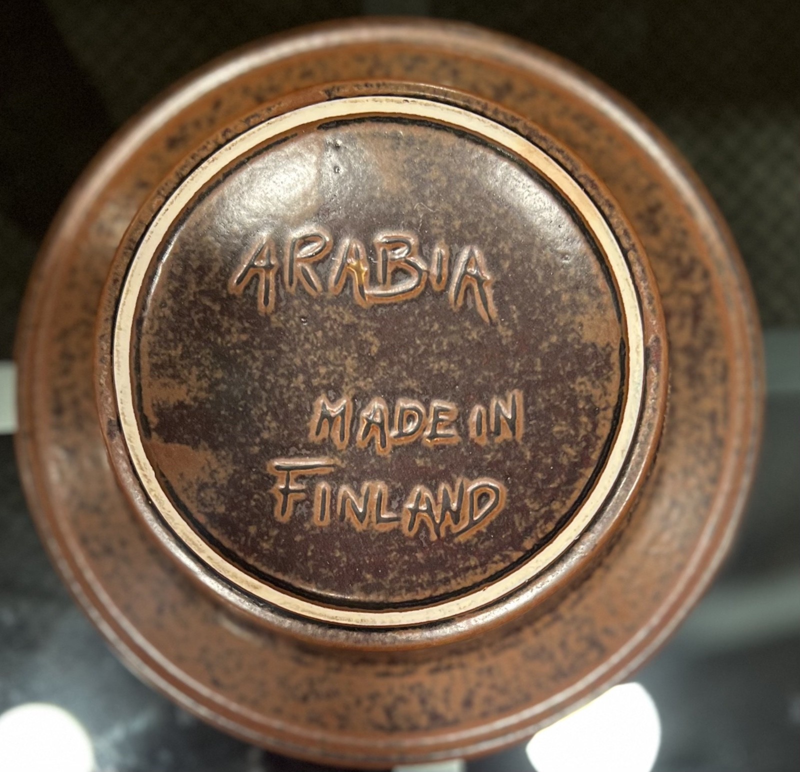 Description: Arabia of Finland Stoneware Ruska Pattern Brown Concentric Circles Bowl. Oven proof stoneware.