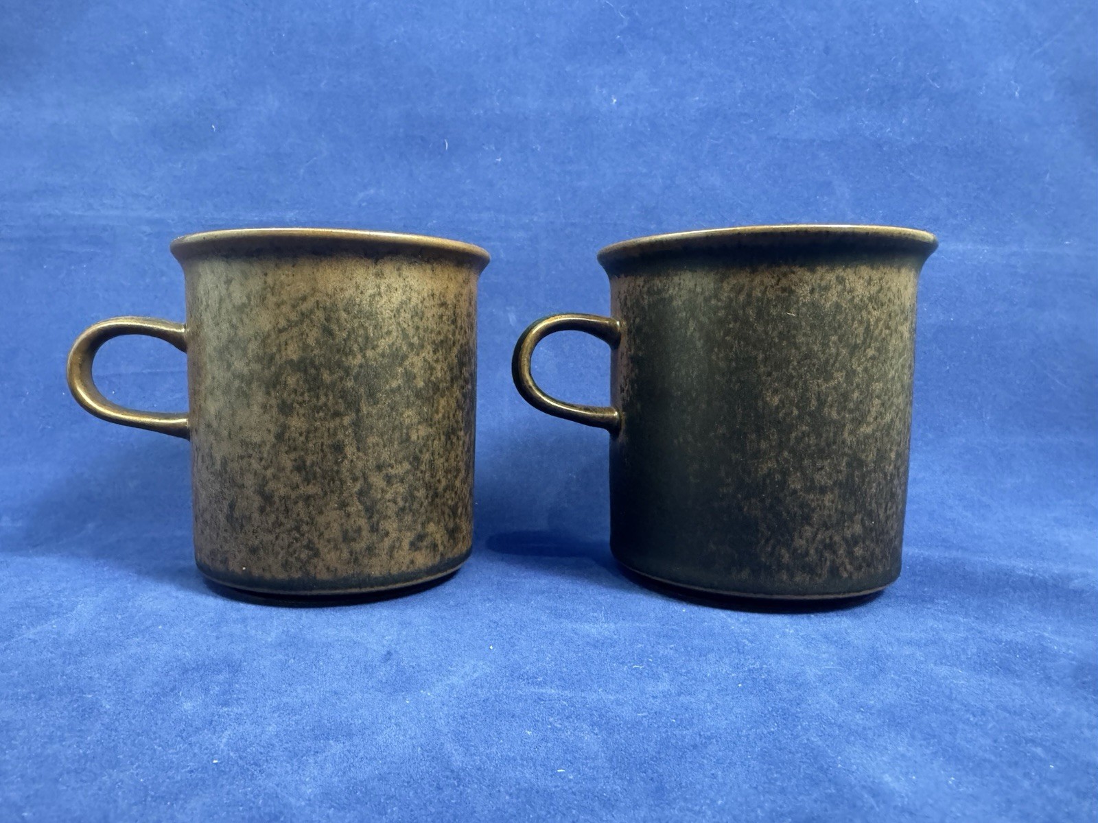 Description: This lot of 2 vintage Arabia Finland Ruska Rustic Brown Tall Coffee Cups exudes Mid-Century Modern style with its matte finish and solid brown color. Made of stoneware using pottery production technique in Finland during the 1960s, these round coffee cups feature a capacity of 1 1/4 cup and a height of 3.5 inches. The cups are adorned with handles and are perfect for all occasions, adding a touch of Scandinavian design to your coffee break or dining experience. Excellent condition. No cracks or chips.