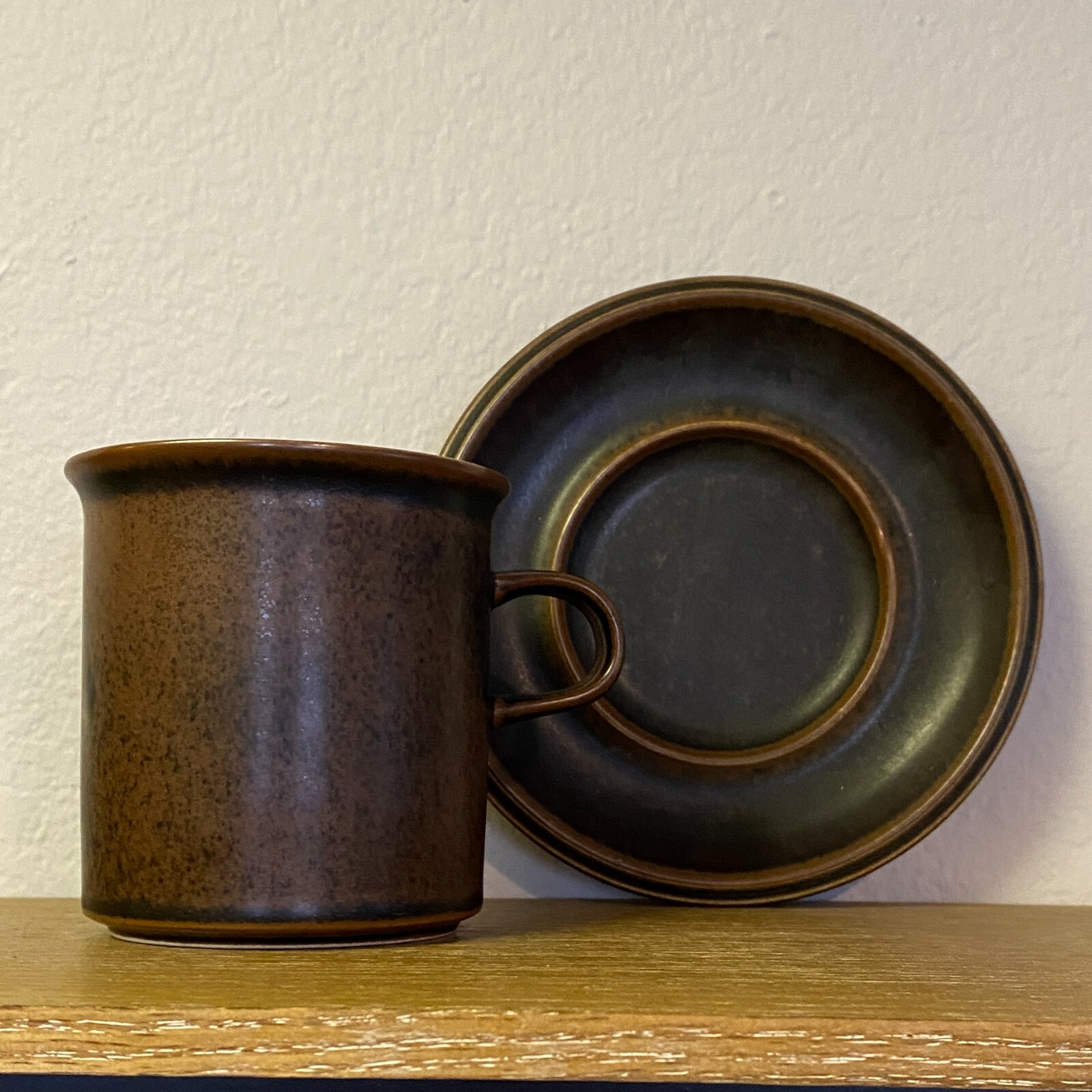 Description: One beautiful Ruska by Arabia of Finland coffee cup and saucer set. Coloring is deep chocolate brown.