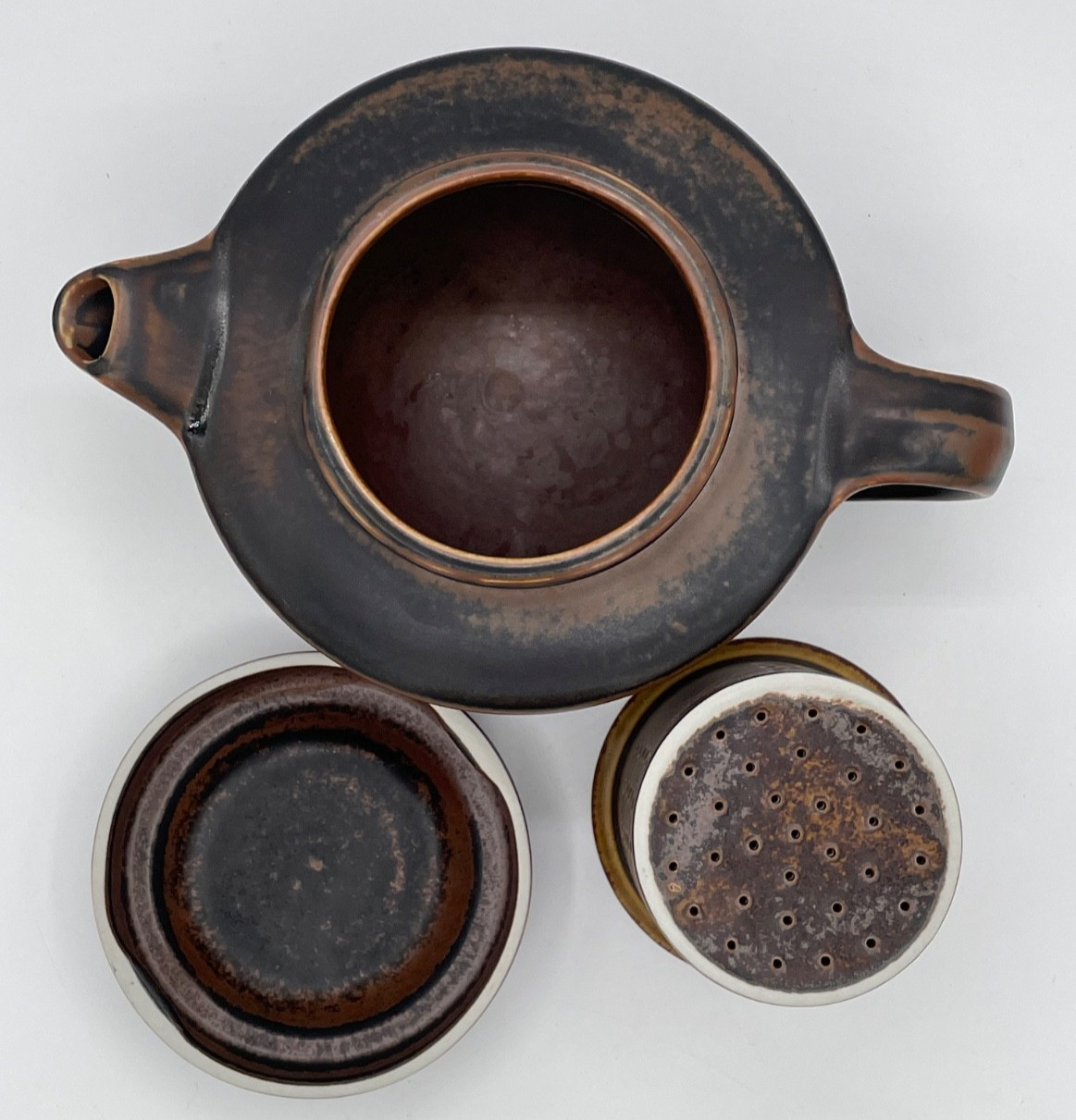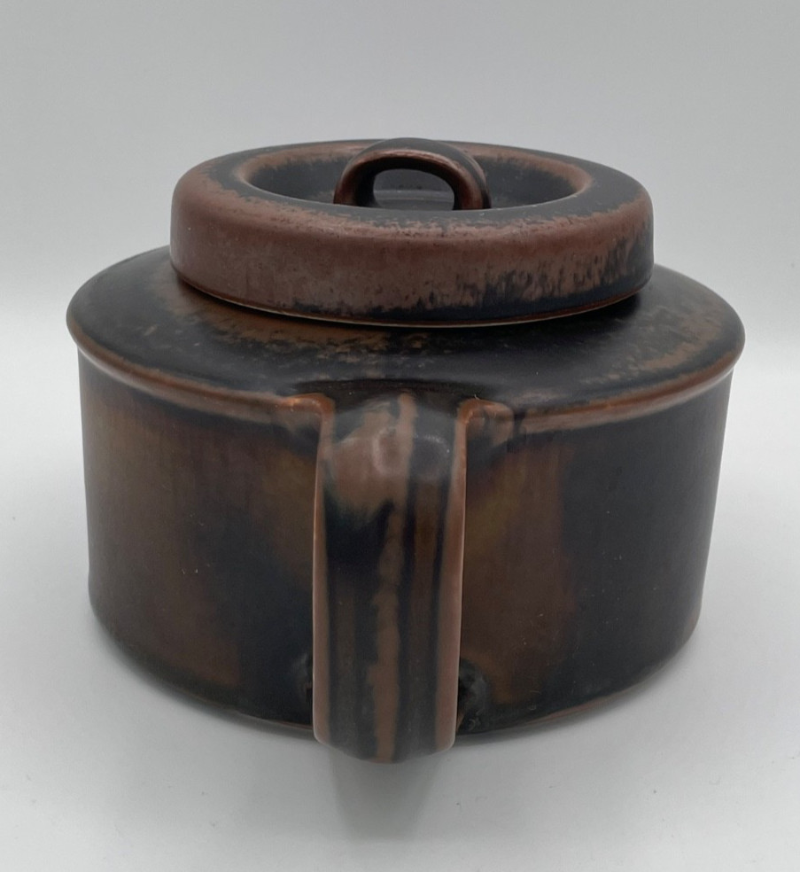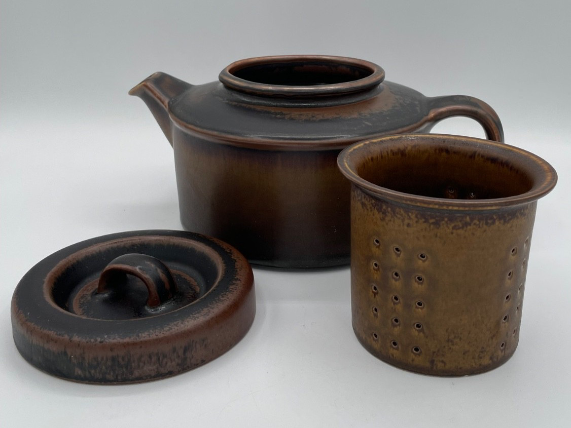 Description: The Vintage Arabia Finland Ruska 5 Cup Ceramic Teapot with Lid and Infuser in Brown is a stunning piece of mid-century modern stoneware pottery from Finland. This original tea pot set includes three items: the teapot, lid, and infuser, all in a rich brown color. With its retro design and production technique of pottery, this vintage teapot set is a unique and stylish addition to any collection of decorative cookware and serveware. Perfect for serving tea in style, this set embodies the aesthetics of the 1960s Scandinavian design movement.