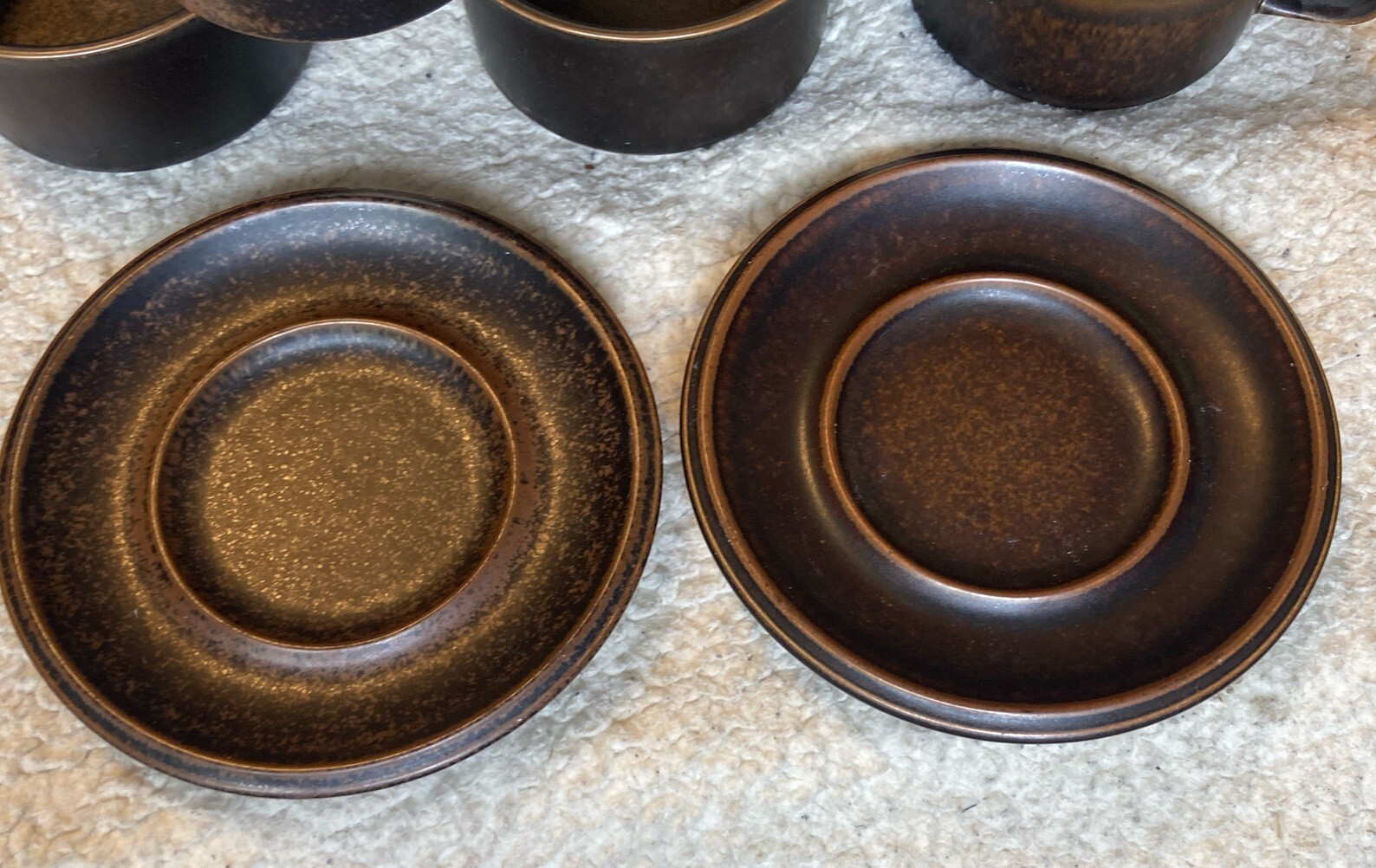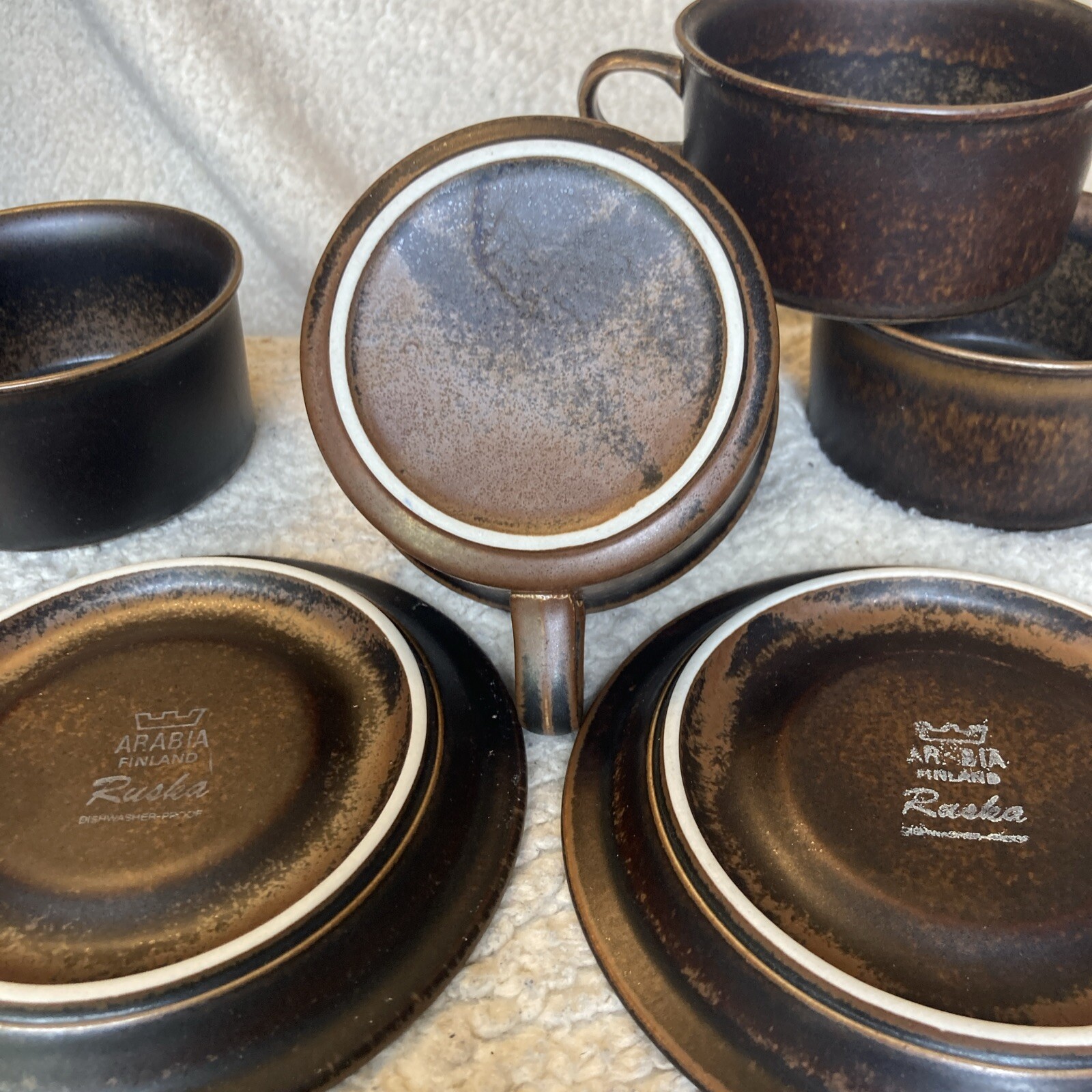 Description: Add a touch of vintage style to your collection with this set of 5 cups and 2 saucers from Arabia Finland’s Ruska stoneware line. The warm, earthy brown color and unique design of the cups and saucers make them a perfect addition to any kitchen or dining room. Crafted with care in Finland, these cups and saucers are both durable and functional, ideal for serving your favorite espresso or tea. The set includes 5 cups and 2 saucers, perfect for entertaining guests or enjoying a quiet morning at home. Great for use or display.