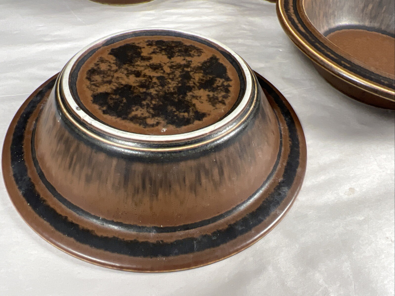 Description: All four bowls are in excellent condition with no chips or cracks. Please note that note 2 of these are alike as they are Hand glazed so each will have a slightly different variation of black versus brown. Each bowl measures just shy of 7” in diameter.