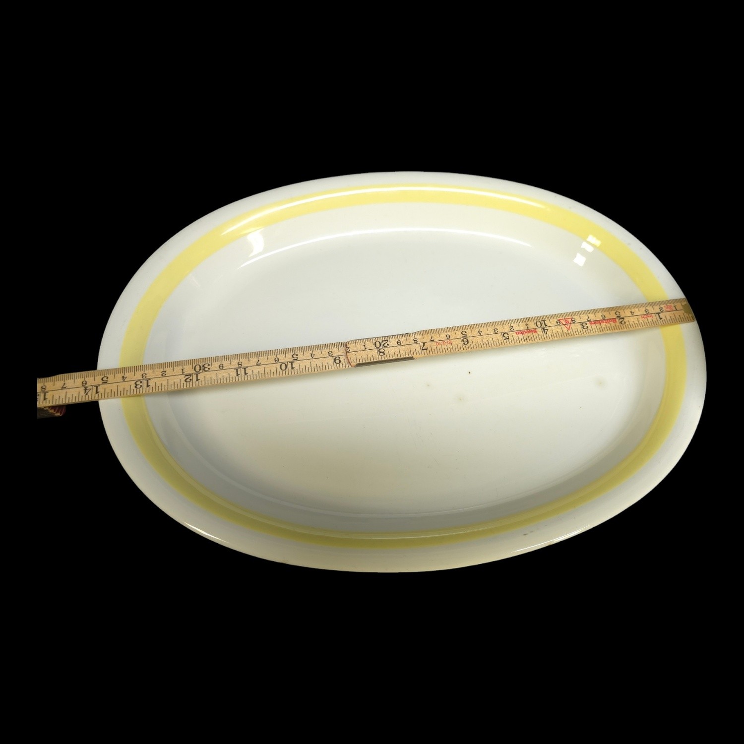 Description: A stunning serving set from Arabia Finland, made in 1962, with a stylish design and a charming yellow stripe as decoration. The set consists of four pieces, including two oval serving dishes, a bowl and a sauce ladle, making it a complete addition to both the retro lover’s and collector’s kitchen.