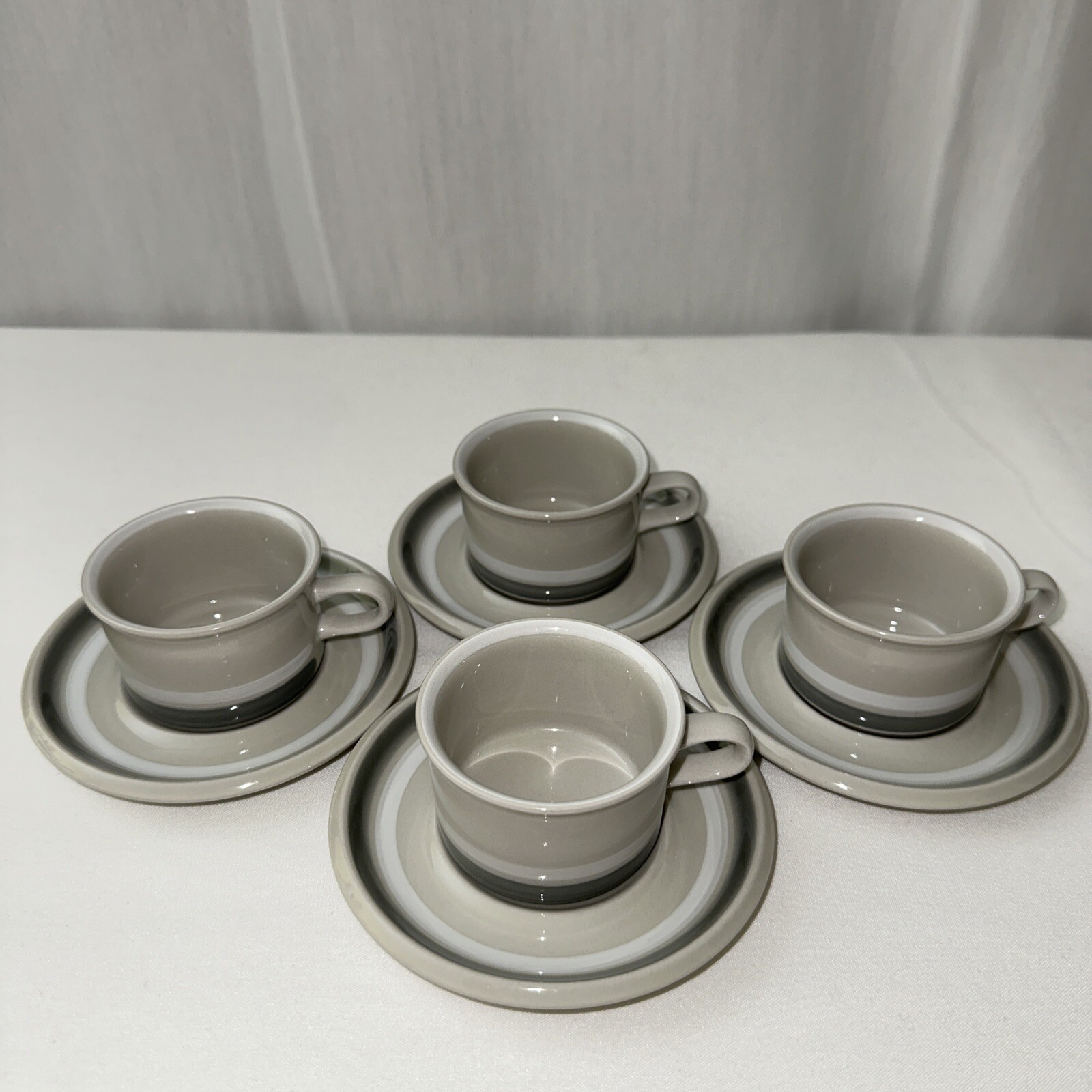Description: Vtg Arabia Finland Salla Gray / White stripe Cup & Saucer Set of 4 – Flat Cups. Set of four cups with saucers (total of 8 pieces). They are light gray with dark gray stripe and white stripe. Perfect condition. Cup: 1-7/8” tall, diameter 2-3/4” Saucer is 5” across