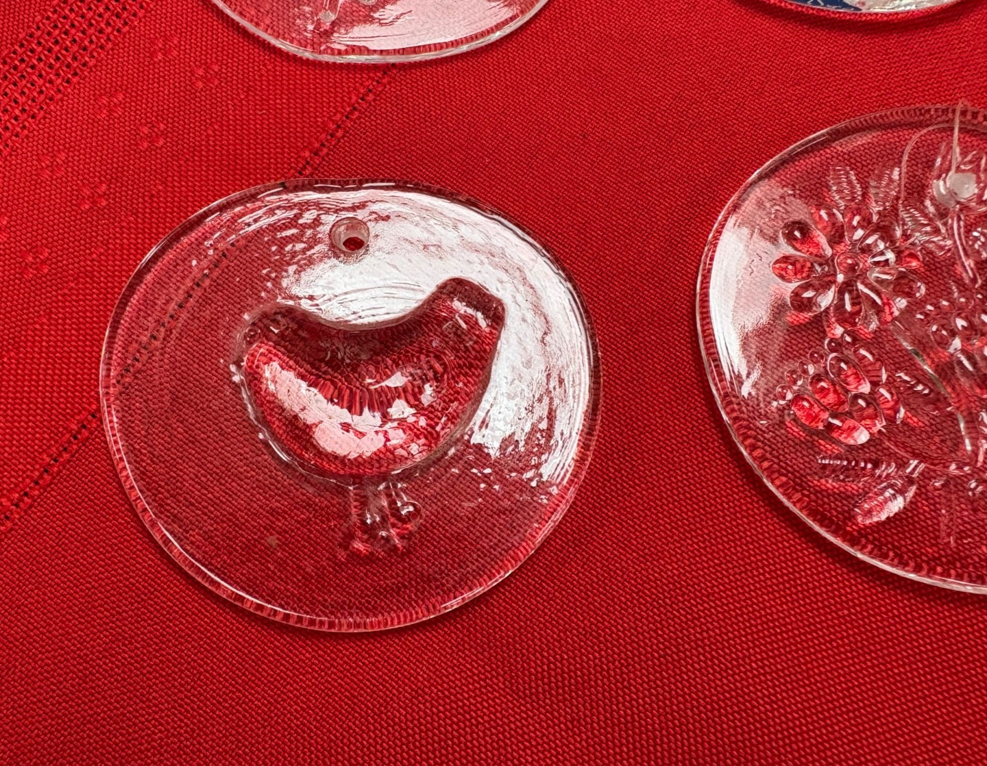 Description: lot of 6 nuutajarvi Arabia Finland pressed glass ornament from 1970 – 1979 , approx sizes 2 1/4″ – 2 3/4″ dia , lot includes 3 snow flakes, one bird one apple and one flower motif, 2 have arabia stickers and 5 have original boxes , all are in goood used condition, if you like what you see here please check out my other listings thank you and happy holidays !