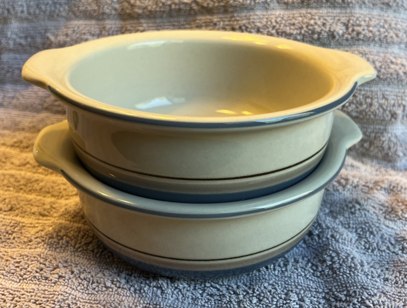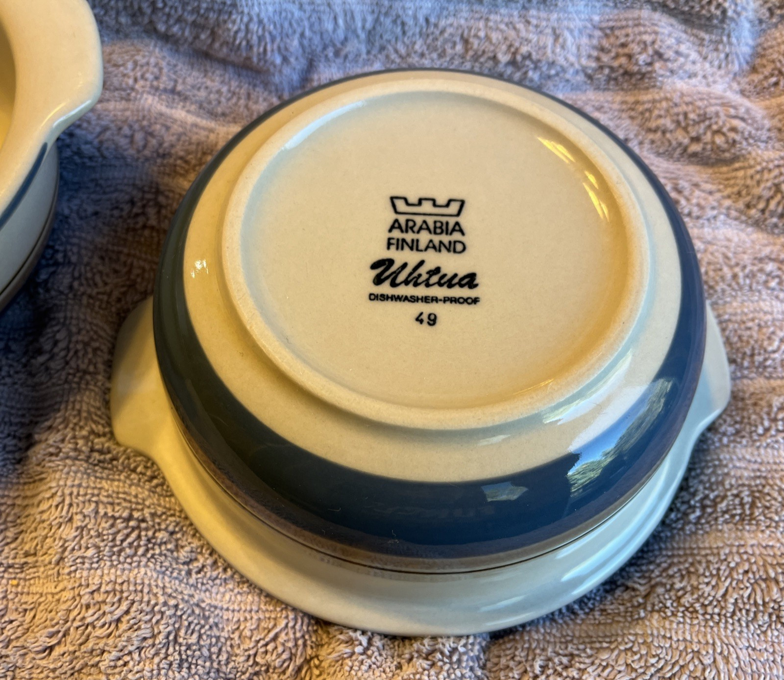 Description: 2 VTG Arabia Finland Bowl Uhtua Blue Tan Rim Band Soup Bowl