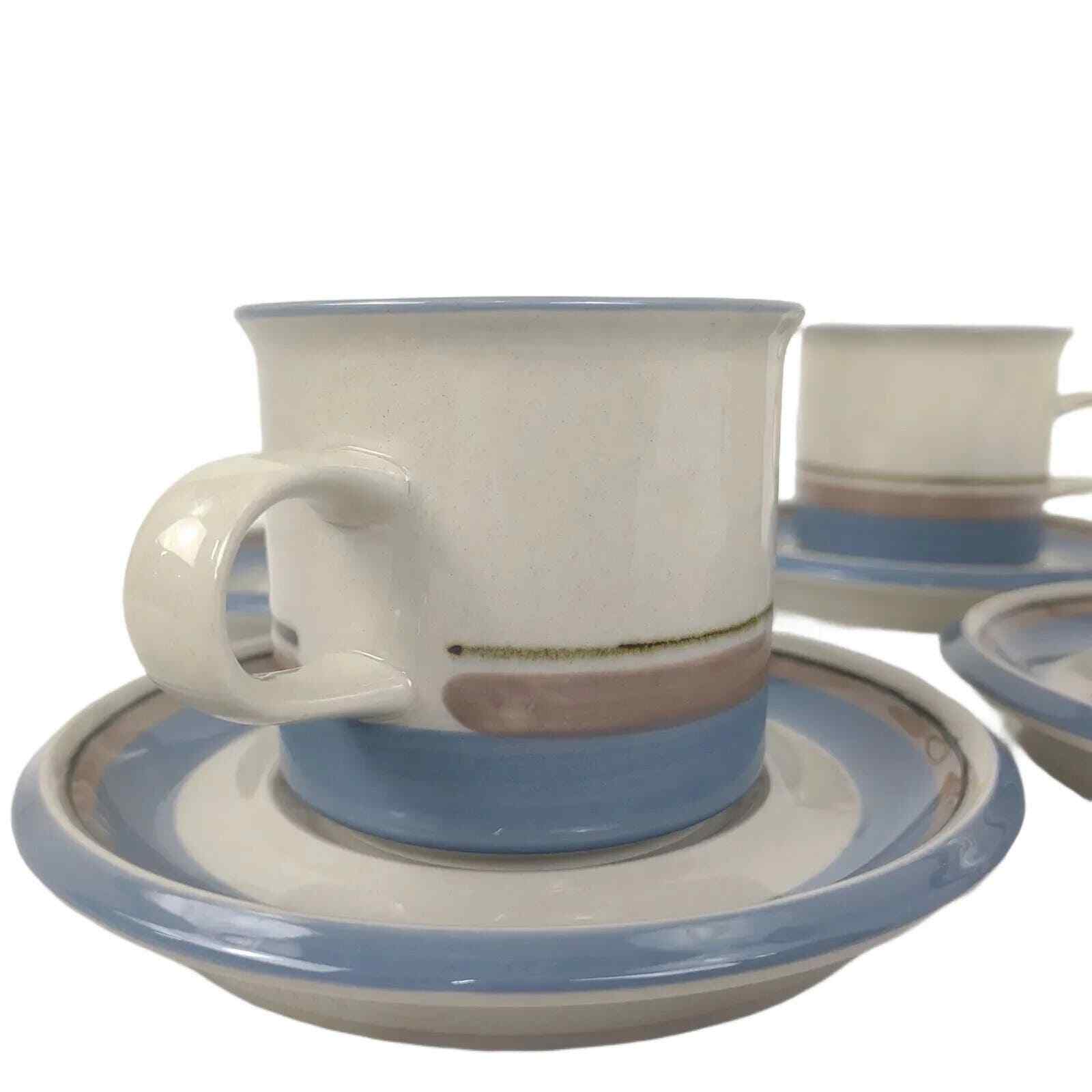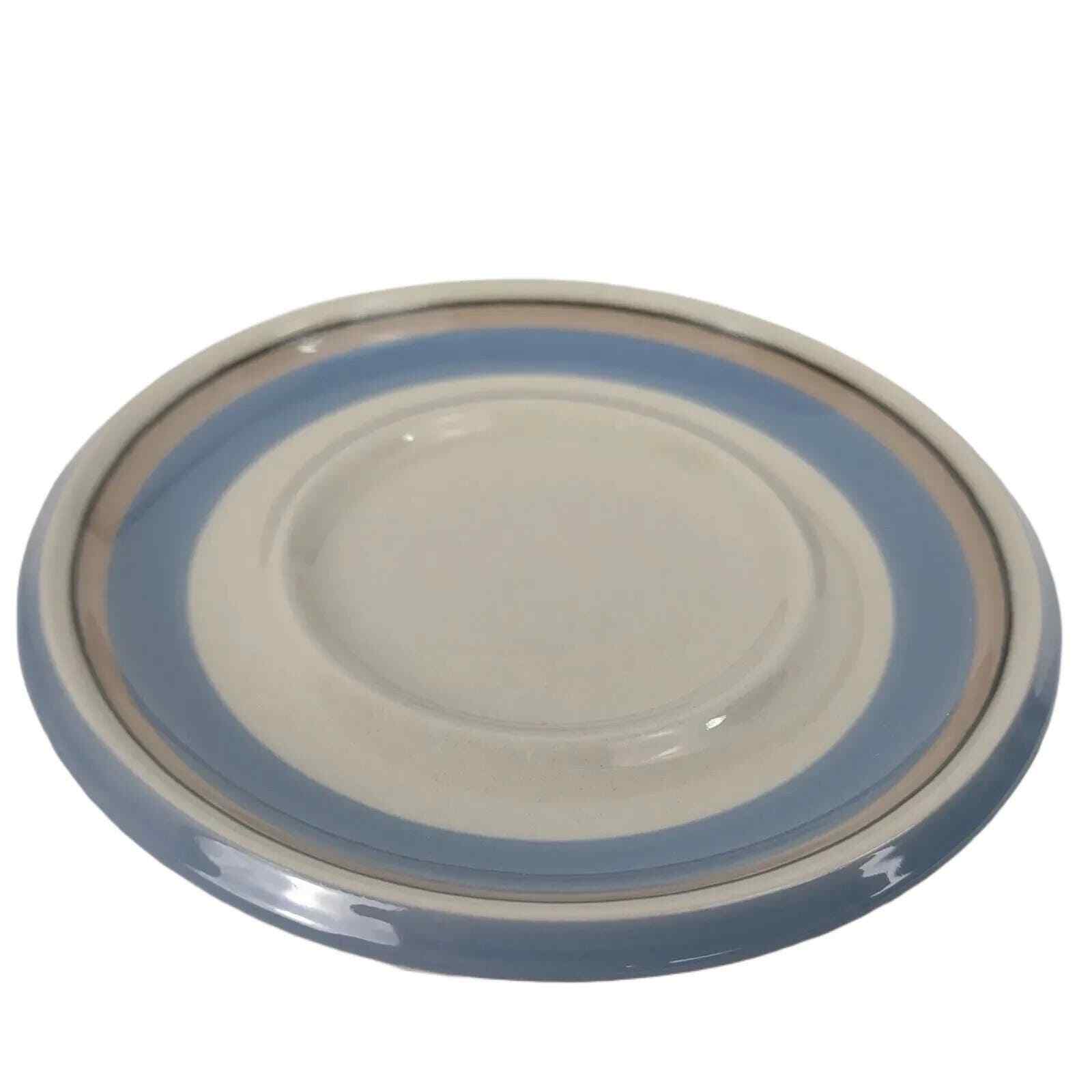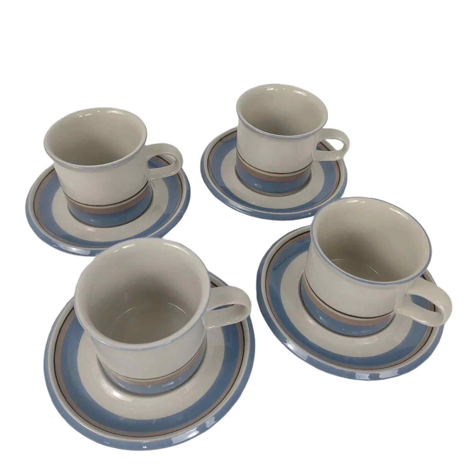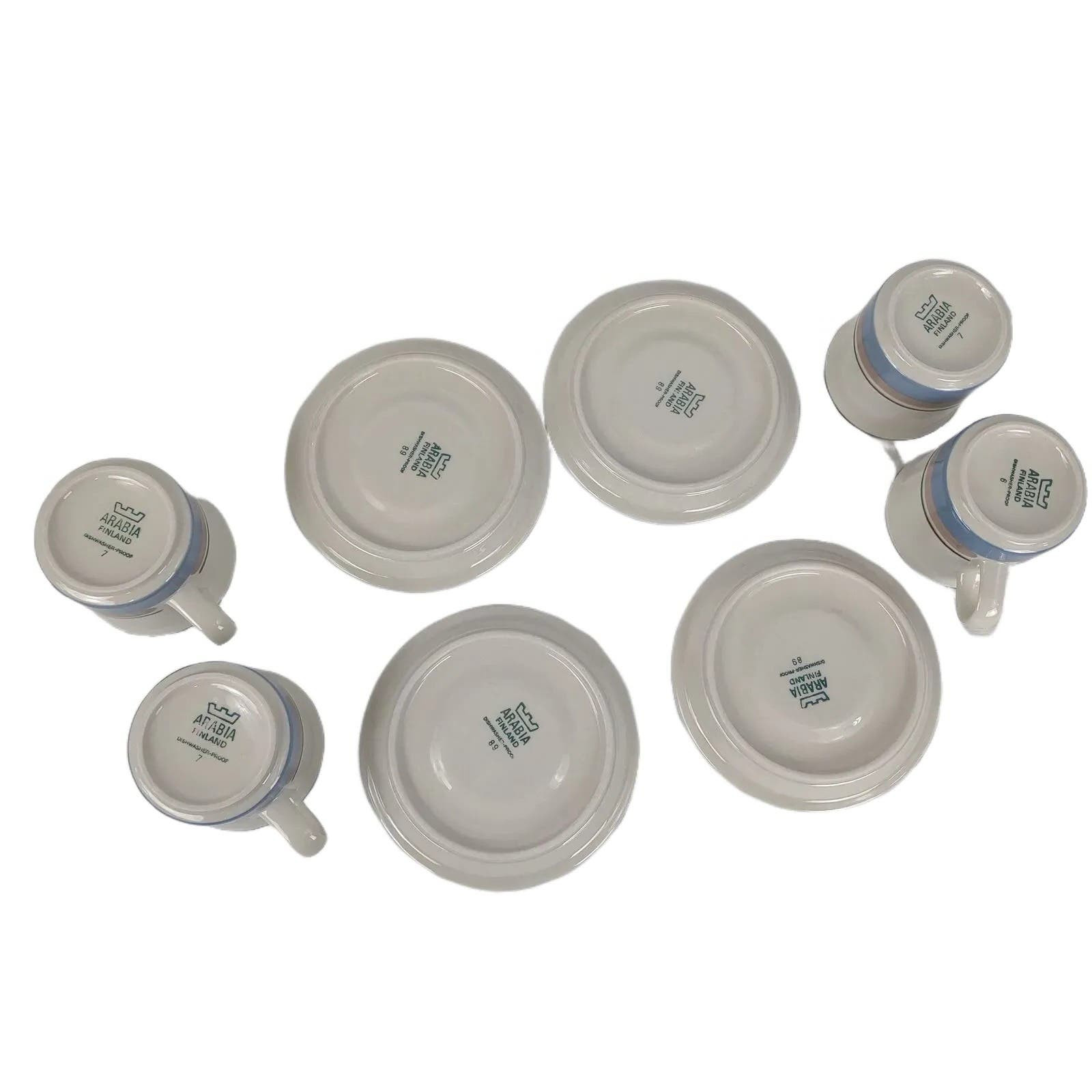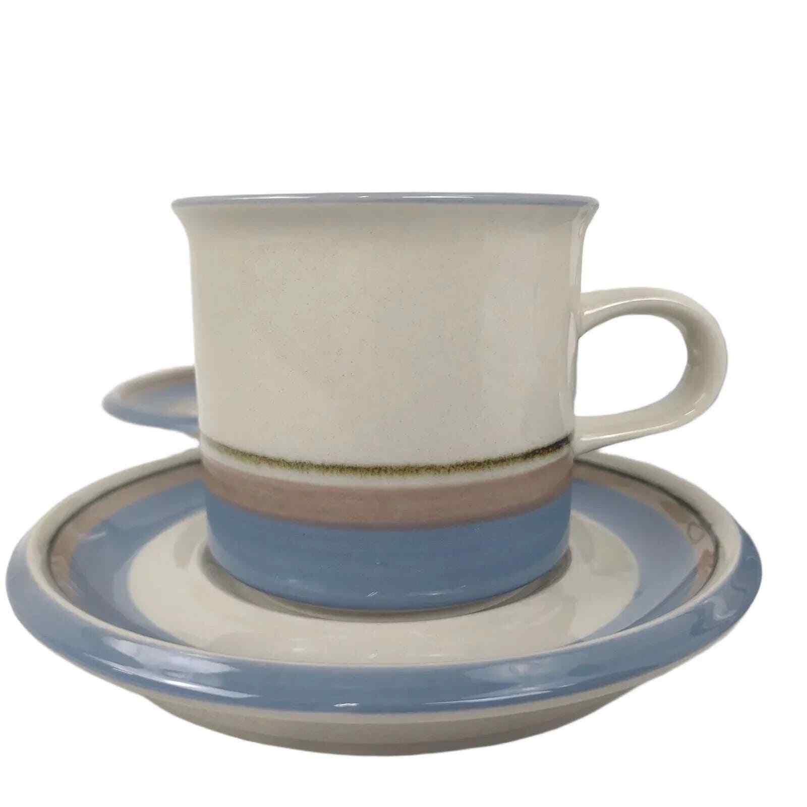 Description: This pattern was first produced in 1985 and continued production through 1997. I believe it is a Inkeri Leivo design. The pattern features a gray-taupe stoneware with blue and tan bands. The underside indicates it is dishwasher safe.