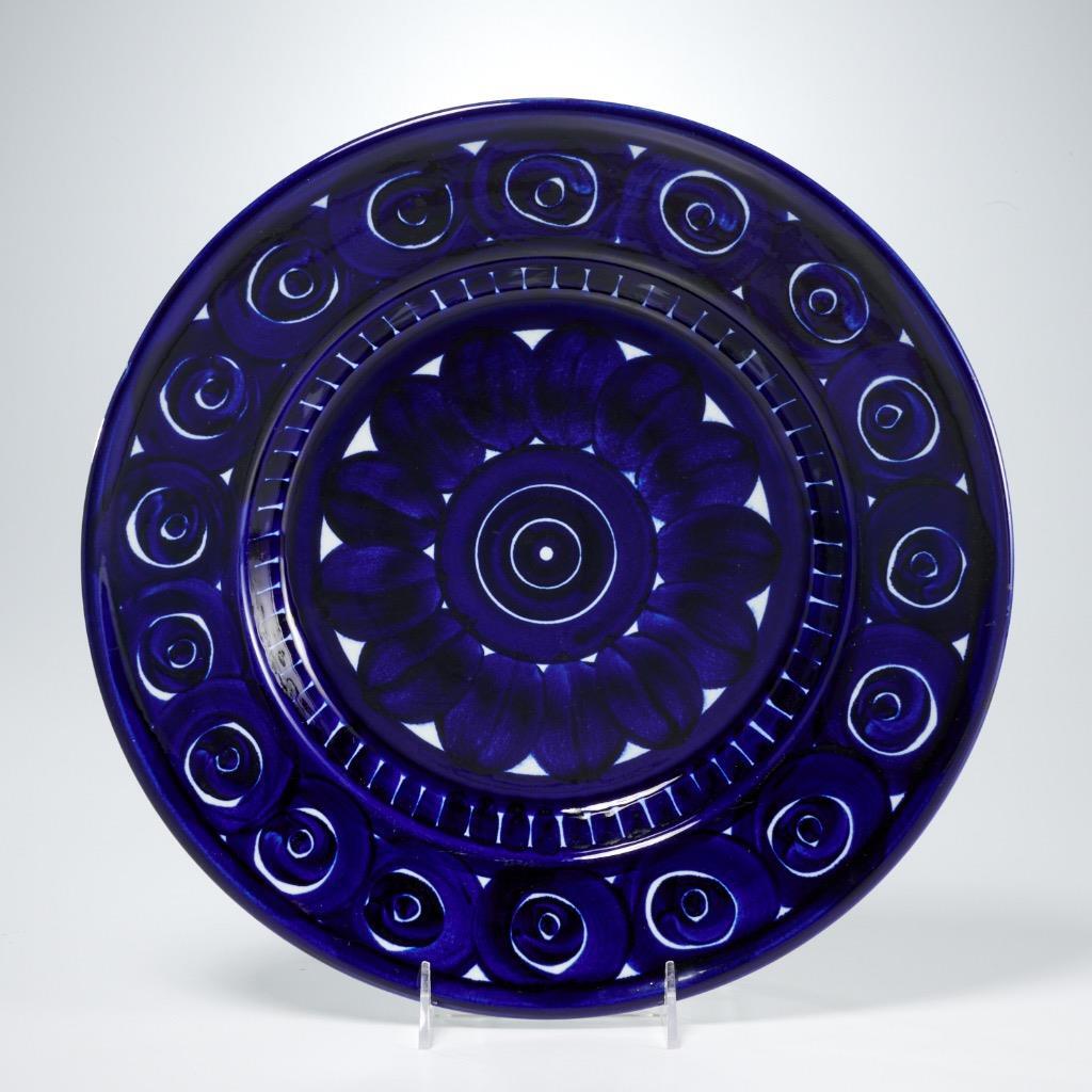 Description: Vintage Arabia Finland Valencia Ulla Procope 14″ Round Chop Plate Platter, signed. Deep cobalt blue and white abstract design. Good pre owned condition, no chips or cracks, some light utensil marks – see photos. Signed to underside, Arabia Finland, artist initials.