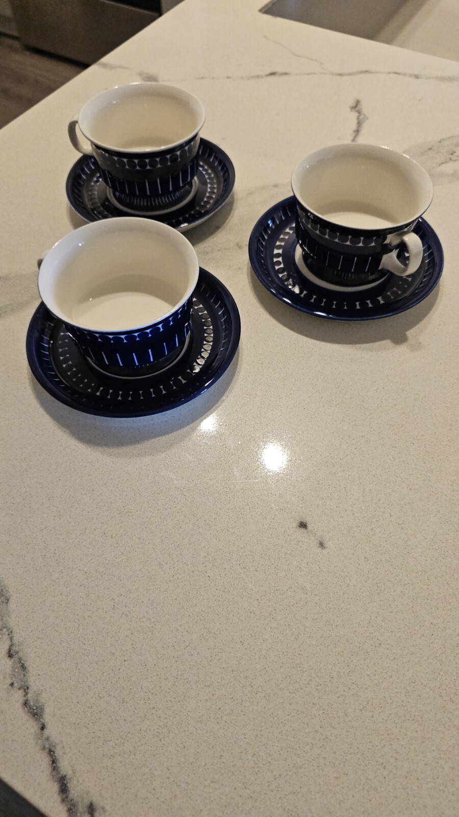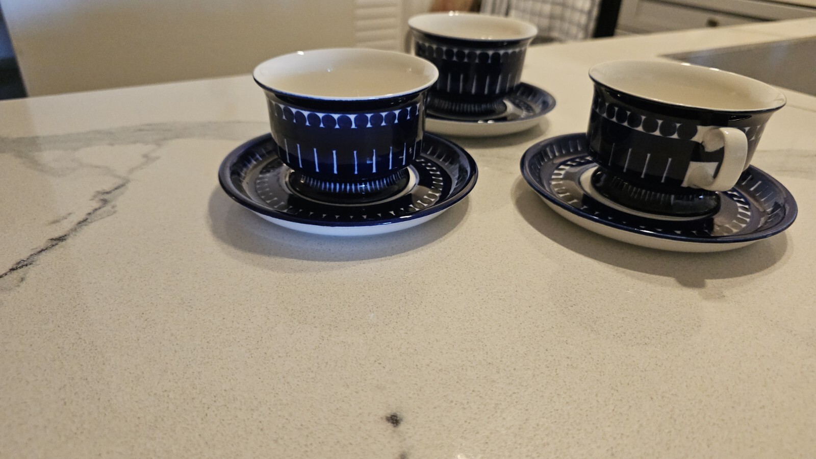 Description: Add a touch of elegance to your coffee routine with these beautiful Arabia Valencia Ulla Procope Mocca Cups/Saucers. Hand-painted with intricate details, these ceramic cups/saucers are a work of art. Made in Finland, they are crafted with care and precision. Each set includes three cups/saucers, perfect for sharing a cup of coffee with friends or family. These cups/saucers are not only functional but also decorative, adding a touch of sophistication to any kitchen or dining room. They are signed by the artist and are sure to impress.