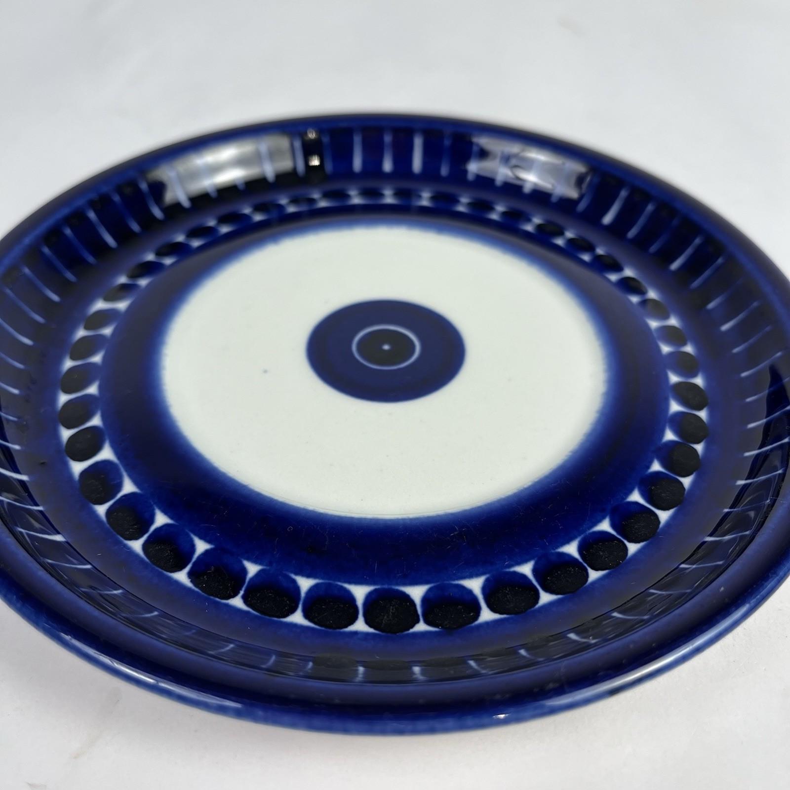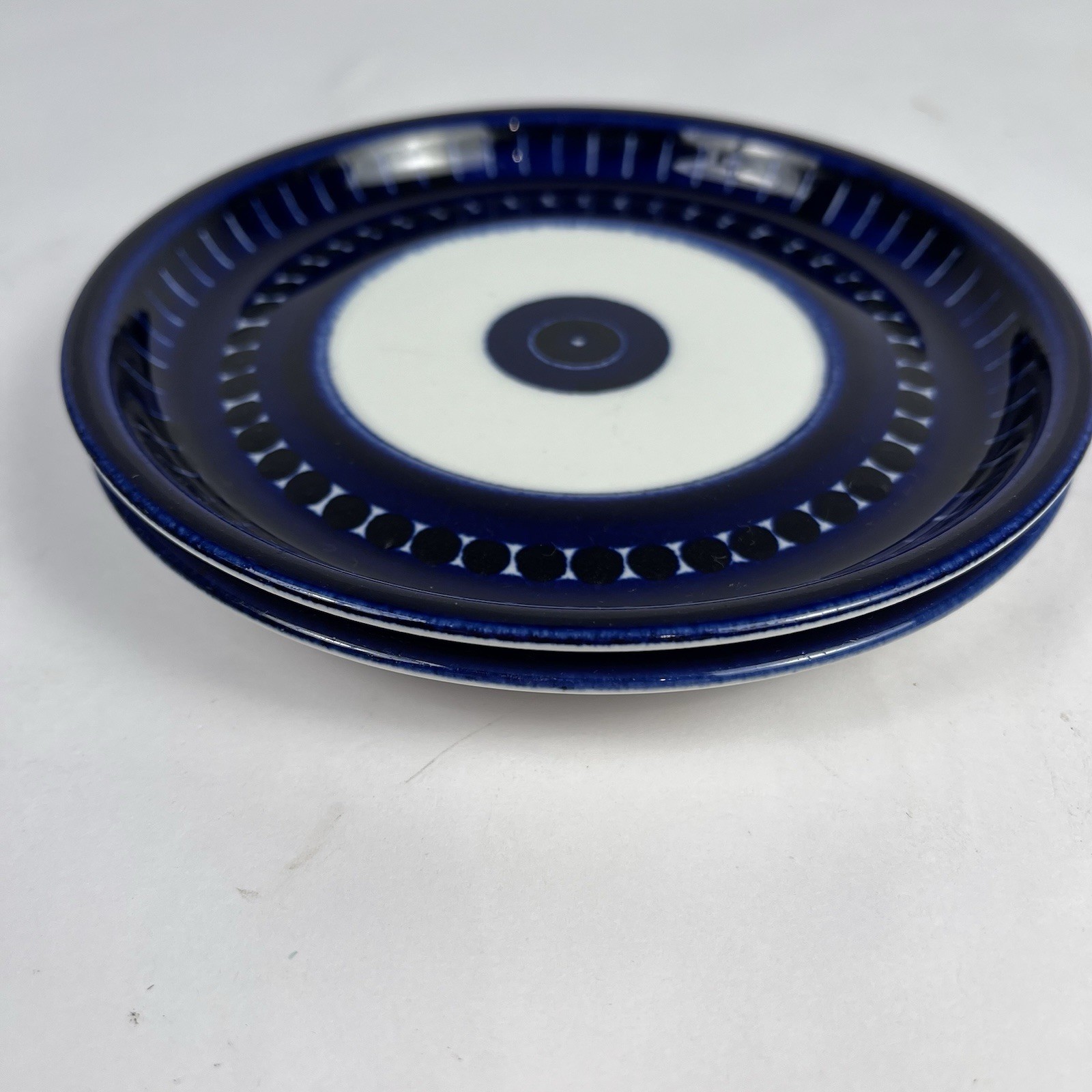 Description: Two vintage round salad or dessert plate from Scandinavia, specifically Finland. It is hand-painted in a mid-century modern style using porcelain and ceramic materials. The plate features a blue color with a glossy finish and bears the signature of Ulla Procope. Produced in the 1960s, this unique piece is perfect for all occasions and requires hand washing for care. Made with art pottery techniques, this original Arabia Finland Valencia salad or dessert plate is a beautiful addition to any adult department’s collection.